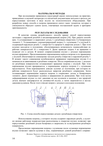При обработке деталей в виде втулок на токарных двухшпиндельных модулях возникает необходимость автоматической переустановки заготовки с основного шпинделя на контршпиндель. При этом в качестве базы может использоваться либо наружная поверхность заготовки, либо поверхность ее отверстия. Если базой служит наружная цилиндрическая поверхность, то применяют способ [1, 2] и патрон кулачковый самоцентрирующий [3, 4]. В случае использования в качестве основы цилиндрического отверстия применяют технологические средства либо с неизменным характером движения зажимных элементов (цанговый патрон [5] или цанговую оправку [6]), либо с переменным движением [7]. Однако все упомянутые варианты переустановки нельзя использовать для резьбовых деталей, если при их переустановке в качестве базы необходимо применение резьбовой поверхности