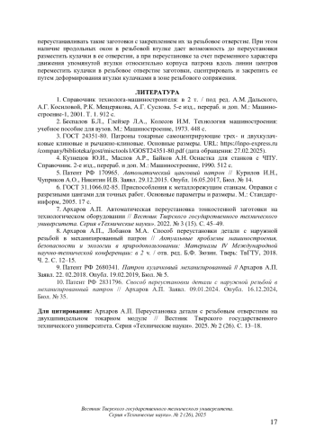 8. Архаров А.П., Лобанов М.А. Способ переустановки детали с наружной резьбой в механизированный патрон // Актуальные проблемы машиностроения, безопасности и экологии в природопользовании: Материалы IV Международной научно-технической конференции: в 2 ч. / отв. ред. Б.Ф. Зюзин. Тверь: ТвГТУ, 2018. Ч. 2. С. 12-15. EDN: XWSVOX