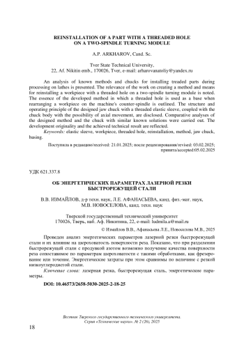 7. Архаров А.П. Автоматическая переустановка тонкостенной заготовки на технологическом оборудовании // Вестник Тверского государственного технического университета. Серия “Технические науки”. 2022. № 3 (15). С. 45-49. EDN: RDUKLA
