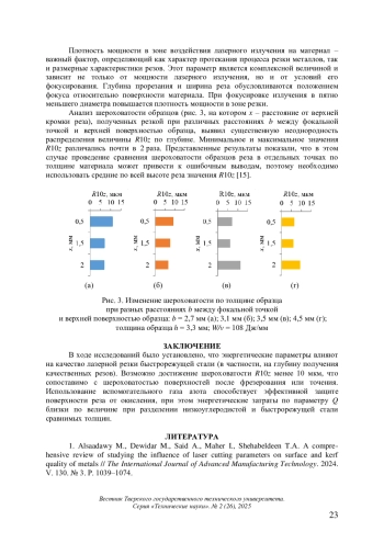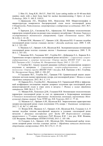 4. Барчуков Д.А., Смолякова И.А., Афанасьева Л.Е. Влияние технологических параметров лазерной резки на размер зоны лазерного воздействия // Вестник Тверского государственного технического университета. Серия “Технические науки”. 2024. № 4 (24). С. 22-28. EDN: GPJLBT