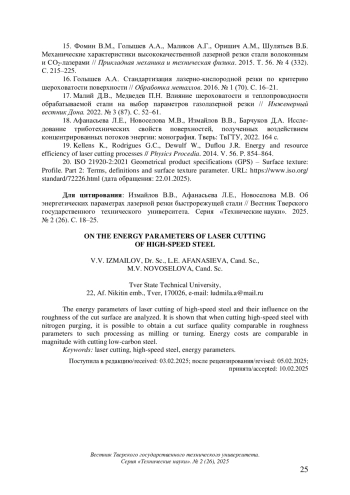 3. Афанасьева Л.Е., Измайлов В.В., Новоселова М.В. Микротопография и микроструктура поверхности быстрорежущей стали после газолазерной резки // Поверхность. Рентгеновские, синхротронные и нейтронные исследования. 2021. № 5. С. 68-75.