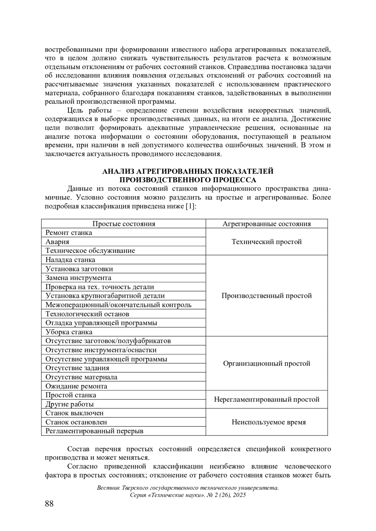Одной из важнейших задач организации серийного производства является обеспечение его ритмичности при максимально возможной загрузке оборудования. Решению этой задачи способствует применение систем сбора данных о состояниях оборудования (MDC-систем). Данные системы ведут непрерывный мониторинг состояния оборудования (работы по управляющей программе, аварийного останова, технологического останова, организационных простоев (т. е. отсутствия инструмента, задания, заготовок и т. п.)), которые группируются по степени влияния на эффективность производственных процессов. Среди простоев оборудования можно выделить хорошо прогнозируемые производственные, технические, организационные и нерегламентированные, обусловленные влиянием случайных факторов; недоступное время, непосредственно связанное с режимом функционирования агрегатов. Уменьшить воздействие разного рода простоев на выпуск продукции отчасти можно с помощью резервирования оборудования, однако в современных условиях это экономически нецелесообразно и позволяет нивелировать последствия лишь технических простоев (аварий, ремонта станка и т. д.).