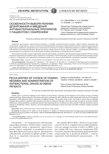 Исследование включает анализ современных научных публикаций, клинических рекомендаций и фармакокинетических данных, касающихся применения антибиотиков у пациентов с ожирением. Особое внимание уделяется изменению объема распределения, клиренсу, и коррекции доз в зависимости от индекса массы тела и других метаболических изменений, связанных с ожирением.