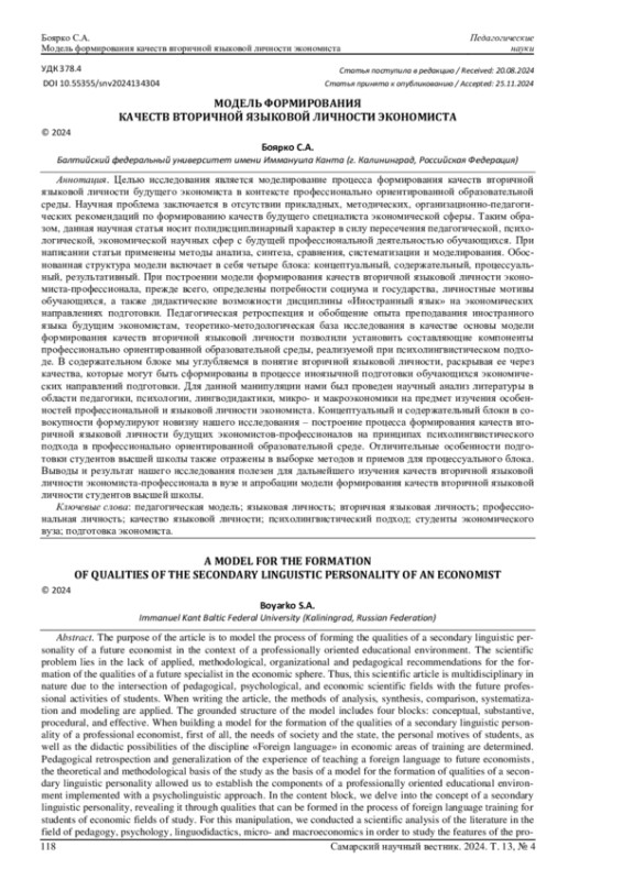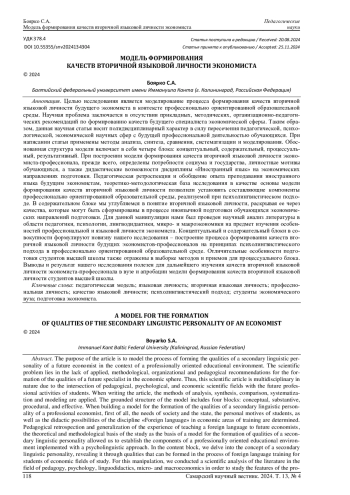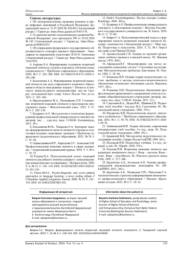 14. Боярко С.А. Психолингвистический подход к формированию качеств вторичной языковой личности будущих экономистов [Электронный ресурс] // Мир науки. Педагогика и психология. 2024. Т. 12, № 5. https://mir-nauki.com/70pdmn524.html. EDN: ERTRWB