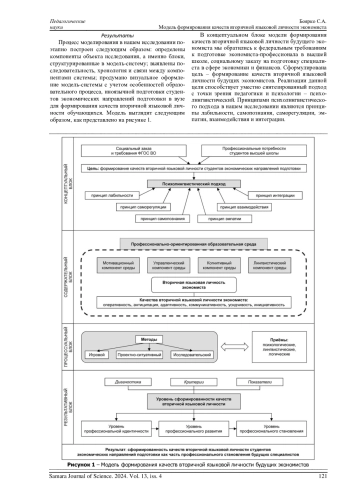 Целью исследования является моделирование процесса формирования качеств вторичной языковой личности будущего экономиста в контексте профессионально ориентированной образовательной среды. Научная проблема заключается в отсутствии прикладных, методических, организационно-педагогических рекомендаций по формированию качеств будущего специалиста экономической сферы. Таким образом, данная научная статья носит полидисциплинарный характер в силу пересечения педагогической, психологической, экономической научных сфер с будущей профессиональной деятельностью обучающихся. При написании статьи применены методы анализа, синтеза, сравнения, систематизации и моделирования. Обоснованная структура модели включает в себя четыре блока: концептуальный, содержательный, процессуальный, результативный. При построении модели формирования качеств вторичной языковой личности экономиста-профессионала, прежде всего, определены потребности социума и государства, личностные мотивы обучающихся, а также дидактические возможности дисциплины «Иностранный язык» на экономических направлениях подготовки. Педагогическая ретроспекция и обобщение опыта преподавания иностранного языка будущим экономистам, теоретико-методологическая база исследования в качестве основы модели формирования качеств вторичной языковой личности позволили установить составляющие компоненты профессионально ориентированной образовательной среды, реализуемой при психолингвистическом подходе. В содержательном блоке мы углубляемся в понятие вторичной языковой личности, раскрывая ее через качества, которые могут быть сформированы в процессе иноязычной подготовки обучающихся экономических направлений подготовки. Для данной манипуляции нами был проведен научный анализ литературы в области педагогики, психологии, лингводидактики, микро- и макроэкономики на предмет изучения особенностей профессиональной и языковой личности экономиста. Концептуальный и содержательный блоки в совокупности формулируют новизну нашего исследования - построение процесса формирования качеств вторичной языковой личности будущих экономистов-профессионалов на принципах психолингвистического подхода в профессионально ориентированной образовательной среде. Отличительные особенности подготовки студентов высшей школы также отражены в выборке методов и приемов для процессуального блока. Выводы и результат нашего исследования полезен для дальнейшего изучения качеств вторичной языковой личности экономиста-профессионала в вузе и апробации модели формирования качеств вторичной языковой личности студентов высшей школы.