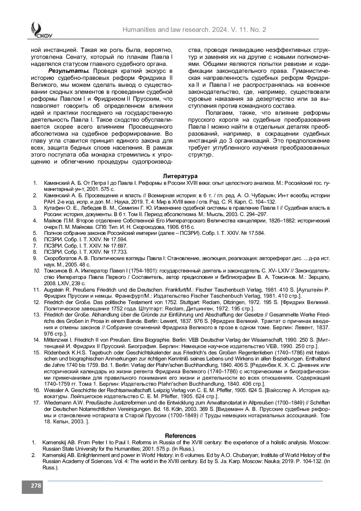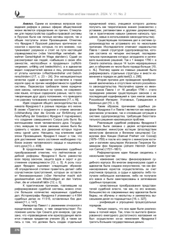 Анализ. Говоря о влиянии прусского короля Фридриха II, как правило, упоминают военную реформу Павла I и введение прусских порядков в российскую армию. Однако, представляется, что опыт Пруссии времен Фридриха Великого использовался и в других преобразованиях Павла I, в том числе в судебно-правовой реформе, так как российский император считал прусскую модель государственного устройства актуальной для России. Построение государства по типу Пруссии требовало инноваций в разных сферах; при их проведении большую роль сыграли мировоззренческие установки и политический дискурс XVIII века. Для выявления идей и практик Фридриха II Прусского в судебно-правовой области были использованы оригинальные работы на немецком языке, демонстрирующие ключевые положения реформы прусского короля. Судебно-правовая реформа Павла I отражена в ряде работ отечественных историков, однако в них не проводится детальное сопоставление аспектов реформы в Пруссии и России. К фактам, демонстрирующих сходство проводимых преобразований, можно отнести отмену пыток и телесных наказаний, реструктуризацию и централизацию органов судебного управления, унификацию и создание нового законодательства.