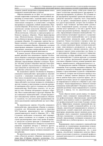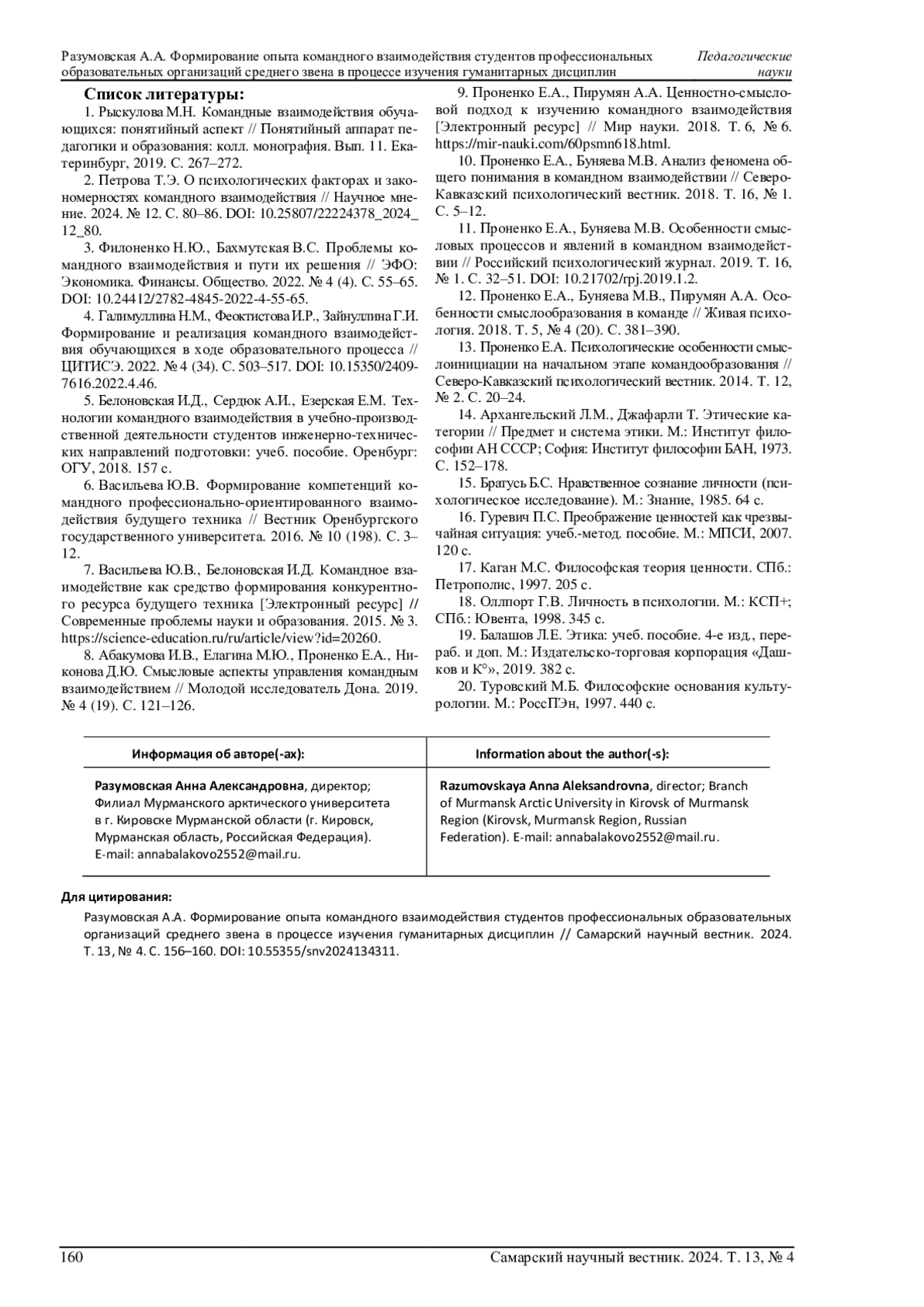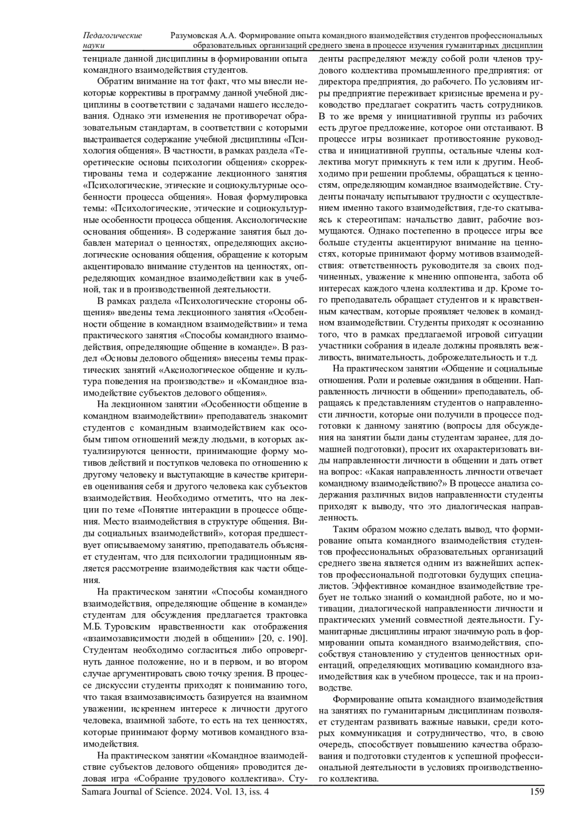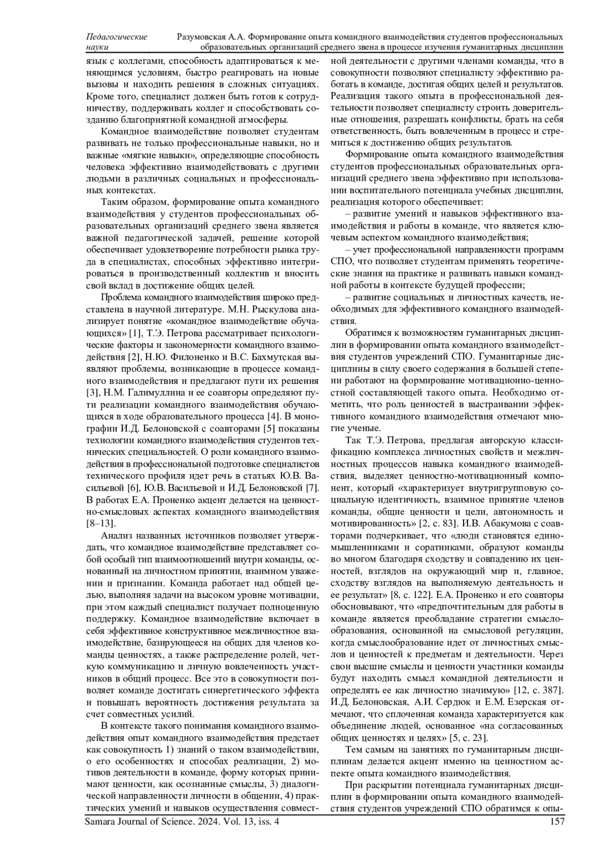 РАЗУМОВСКАЯ А. А. ФОРМИРОВАНИЕ ОПЫТА КОМАНДНОГО ВЗАИМОДЕЙСТВИЯ СТУДЕНТОВ ПРОФЕССИОНАЛЬНЫХ ОБРАЗОВАТЕЛЬНЫХ ОРГАНИЗАЦИЙ СРЕДНЕГО ЗВЕНА В ПРОЦЕССЕ ИЗУЧЕНИЯ ГУМАНИТАРНЫХ ДИСЦИПЛИН // САМАРСКИЙ НАУЧНЫЙ ВЕСТНИК. 2024. ТОМ 13, № 4
