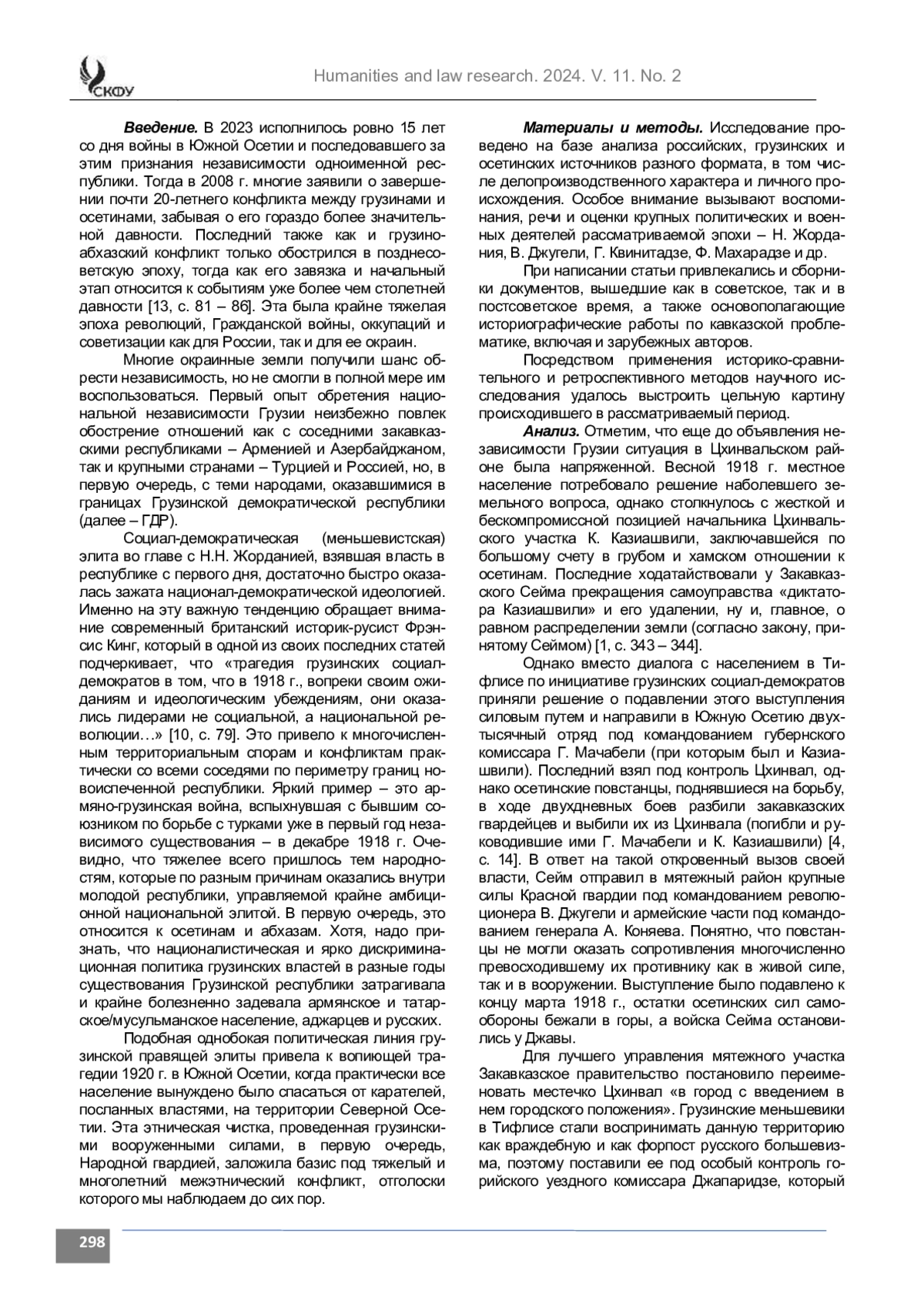 Введение. В статье рассматриваются предыстория, причины и начальный этап грузино-осетинского конфликта, завязанные на агрессивной и националистической политике властей Грузинской демократической республики в период независимости – 1918–1921 гг.