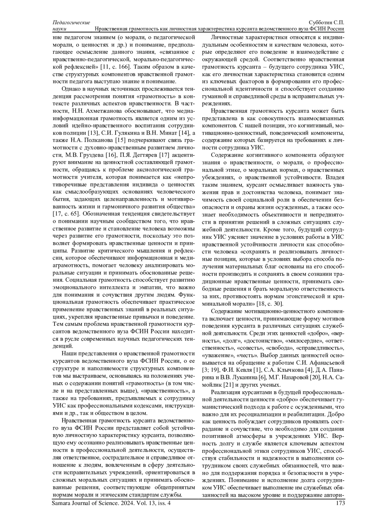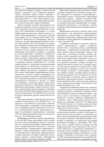 В статье актуализируется проблема нравственного воспитания курсантов ведомственного вуза ФСИН России, одним из направлений которого становится формирование нравственной грамотности курсантов. Осуществляется анализ понятия «грамотность» и выявляются виды грамотности в целом и виды грамотности сотрудников УИС, формируемые в процессе профессиональной подготовки в ведомственных вузах ФСИН России. Раскрывается тенденция рассмотрения понятия «грамотность» в контексте различных аспектов нравственности при отсутствии в научном поле трудов, непосредственно посвященных нравственной грамотности курсантов. Обосновывается, что нравственная грамотность курсанта ведомственного вуза ФСИН России представляет собой устойчивую личностную характеристику курсанта, позволяющую ему осознанно реализовывать нравственные ценности в профессиональной деятельности, осуществляя ответственное, сострадательное и справедливое отношение к людям, вовлеченным в сферу деятельности исправительных учреждений, ориентироваться в сложных моральных ситуациях и принимать обоснованные решения, соответствующие общепринятым нормам морали и этическим стандартам службы. Раскрывается содержание нравственной грамотности курсантов ведомственного вуза ФСИН России через выделение когнитивного, мотивационно-ценностного и поведенческого компонентов, наполнение которых базируется на требованиях к личности сотрудника УИС. Предлагается содержание когнитивного компонента, образуемого знаниями о нравственности, о морали, о профессиональной этике, о моральных нормах, о нравственных убеждениях, о нравственной устойчивости. Обосновывается состав мотивационно-ценностного компонента: ценности «добро», «верность», «долг», «достоинство», «милосердие», «ответственность», «совесть», «свобода», «справедливость», «уважение», «честь». Обозначается содержание поведенческого компонента: нравственные качества «доброта», «обязательность», «благородство», «сострадание», «терпимость», «честность», «требовательность», «самостоятельность», «совестливость», «великодушие», «надежность».