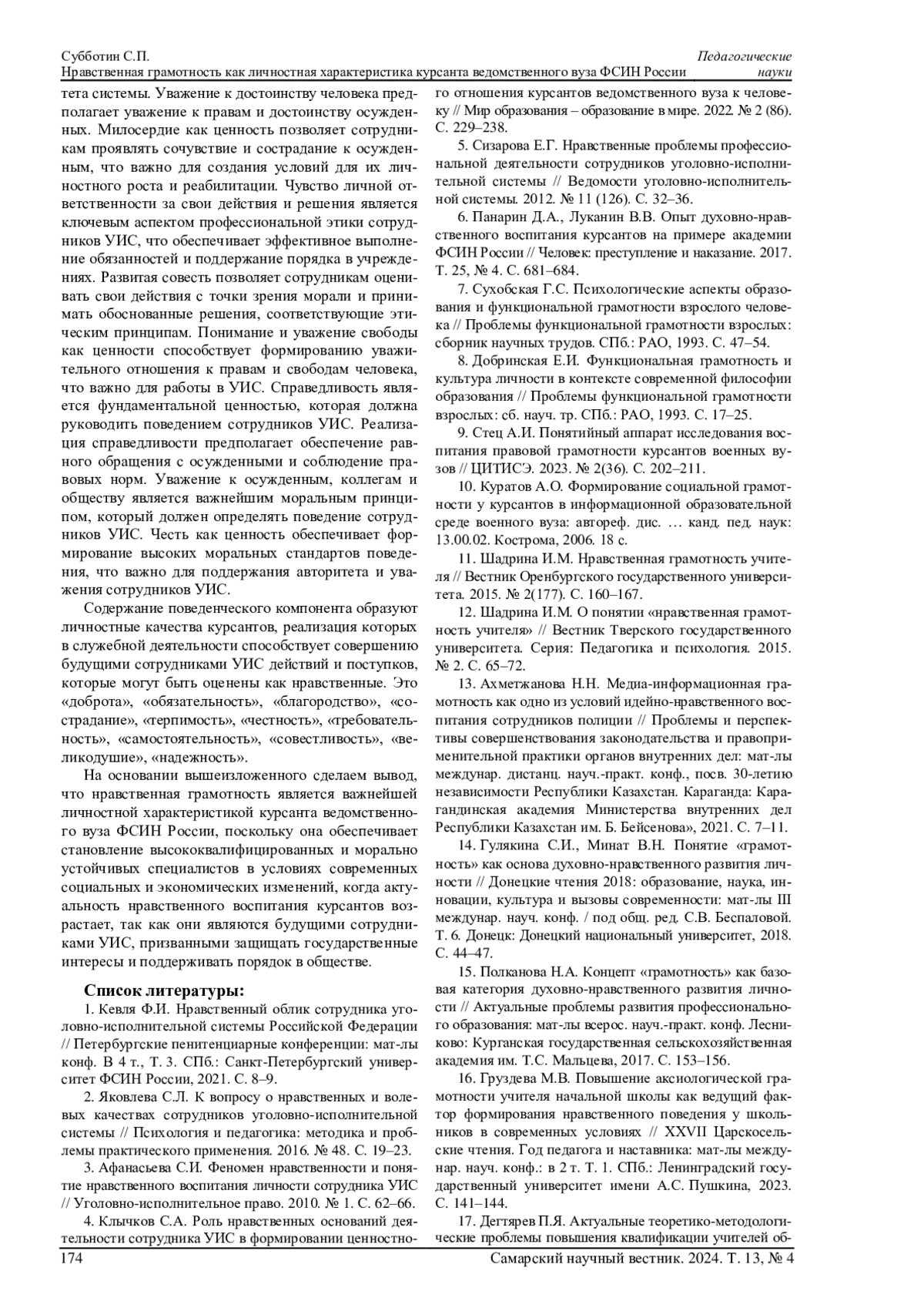 4. Клычков С.А. Роль нравственных оснований деятельности сотрудника УИС в формировании ценностного отношения курсантов ведомственного вуза к человеку // Мир образования - образование в мире. 2022. № 2 (86). С. 229-238. EDN: KKFXOA