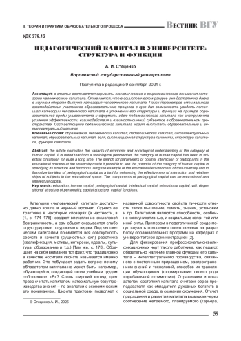 В статье соотносятся варианты экономического и социологического понимания категории человеческого капитала. Отмечается, что в социологическом ракурсе уже достаточно давно в научном обороте бытует категория человеческого капитала. Поиск параметров оптимального взаимодействия участников образовательного процесса в вузе дал возможность увидеть потенциал категории человеческого капитала в уточнении его структуры и функций на примере образовательной среды университета и оформить идею педагогического капитала как инструмента усиления эффективности взаимодействия и взаимоотношений субъектов в образовательном пространстве. Составляющими педагогического капитала могут выступать образовательный и интеллектуальный капитал.