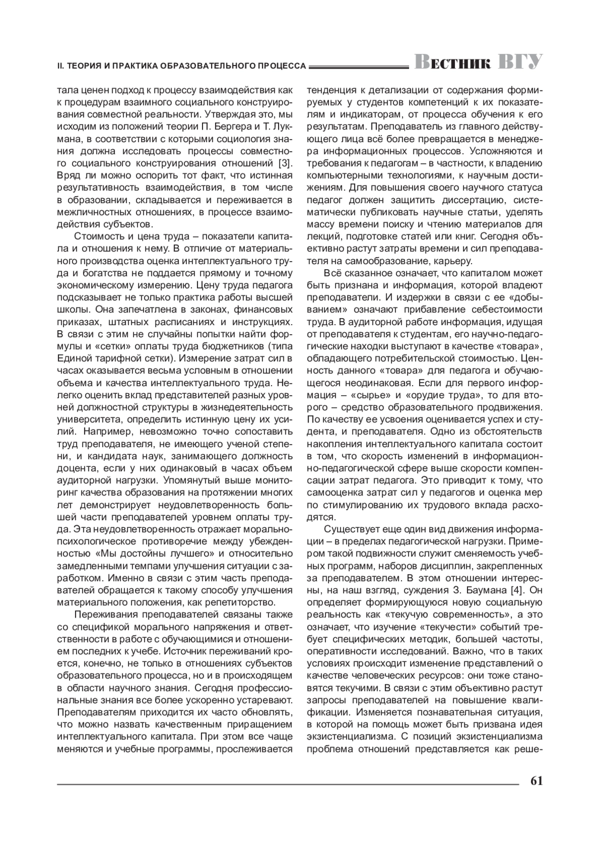 Всё сказанное означает, что капиталом может быть признана и информация, которой владеют преподаватели. И издержки в связи с ее «добыванием» означают прибавление себестоимости труда. В аудиторной работе информация, идущая от преподавателя к студентам, его научно-педагогические находки выступают в качестве «товара», обладающего потребительской стоимостью. Ценность данного «товара» для педагога и обучающегося неодинаковая. Если для первого информация – «сырье» и «орудие труда», то для второго – средство образовательного продвижения. По качеству ее усвоения оценивается успех и студента, и преподавателя. Одно из обстоятельств накопления интеллектуального капитала состоит в том, что скорость изменений в информационно-педагогической сфере выше скорости компенсации затрат педагога. Это приводит к тому, что самооценка затрат сил у педагогов и оценка мер по стимулированию их трудового вклада расходятся.