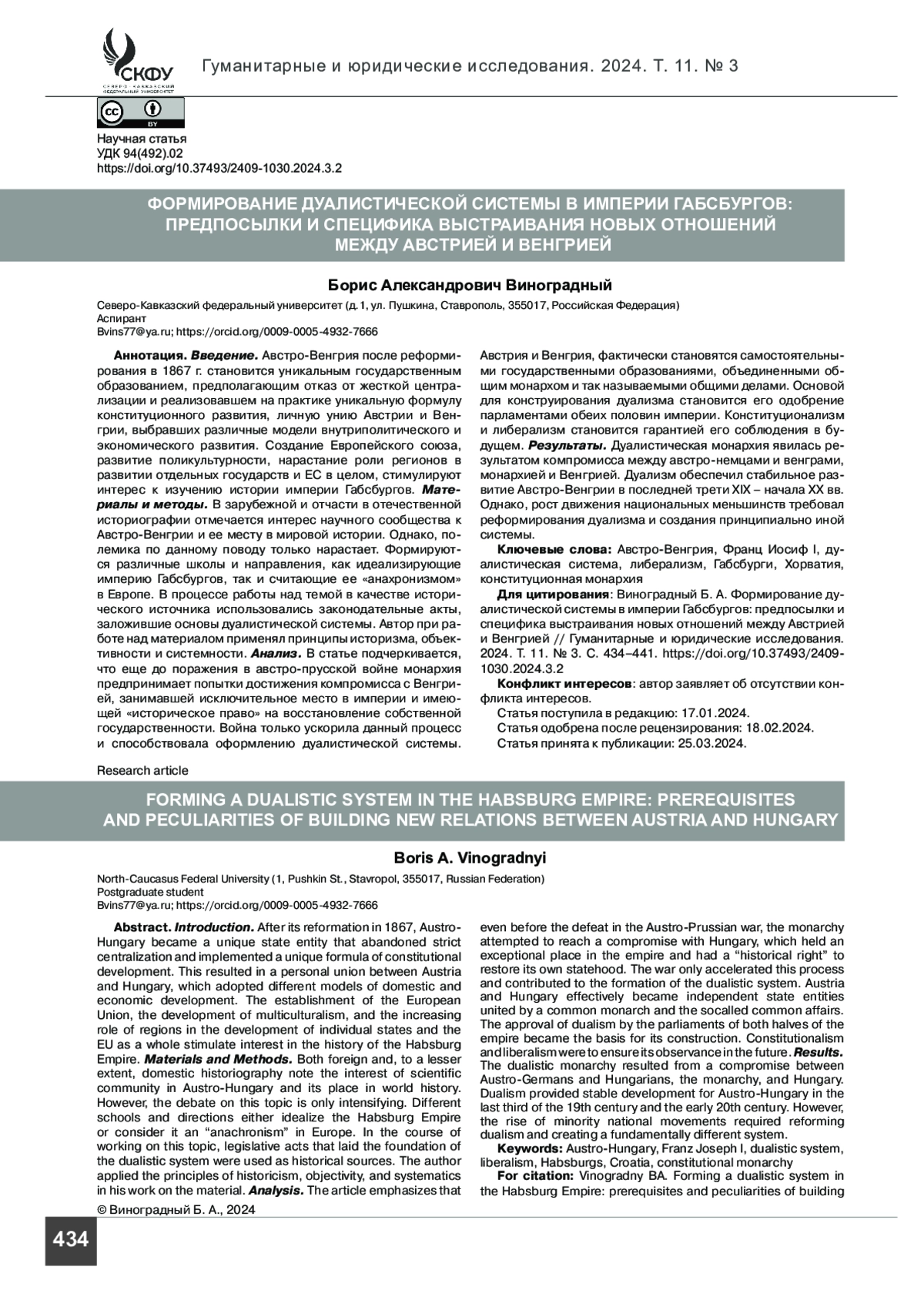 Материалы и методы. В зарубежной и отчасти в отечественной историографии отмечается интерес научного сообщества к Австро-Венгрии и ее месту в мировой истории. Однако, полемика по данному поводу только нарастает. Формируются различные школы и направления, как идеализирующие империю Габсбургов, так и считающие ее «анахронизмом» в Европе. В процессе работы над темой в качестве исторического источника использовались законодательные акты, заложившие основы дуалистической системы. Автор при работе над материалом применял принципы историзма, объективности и системности.