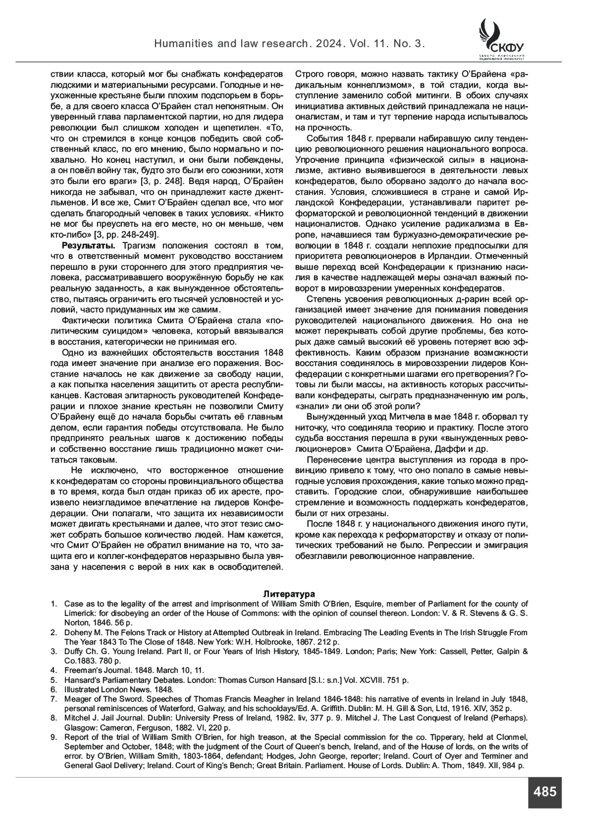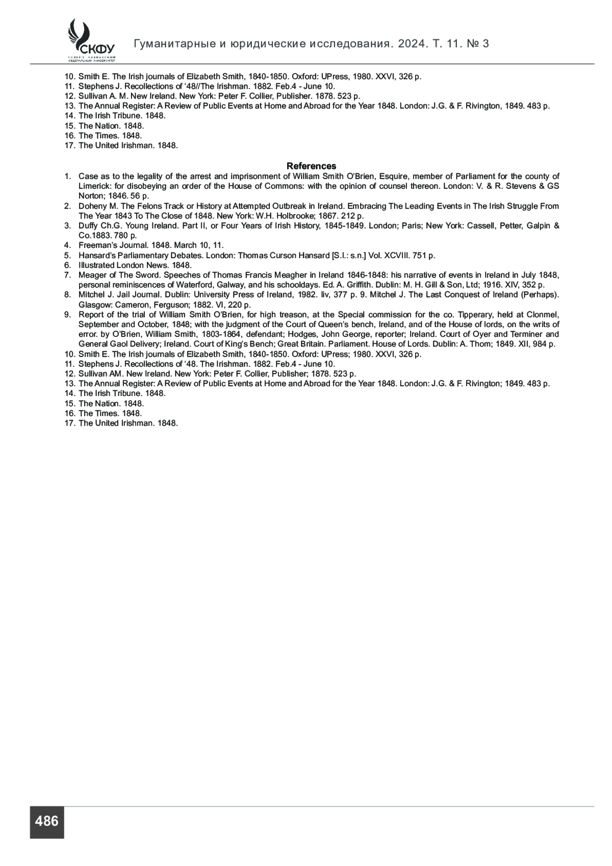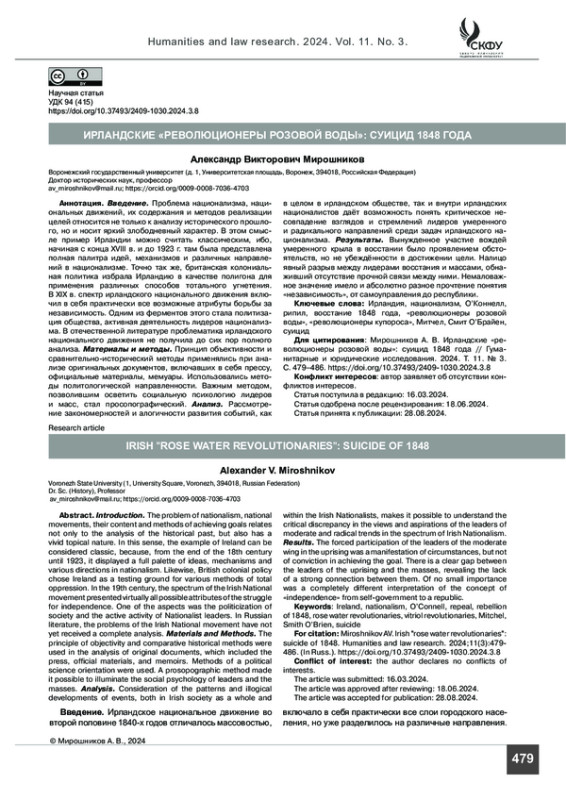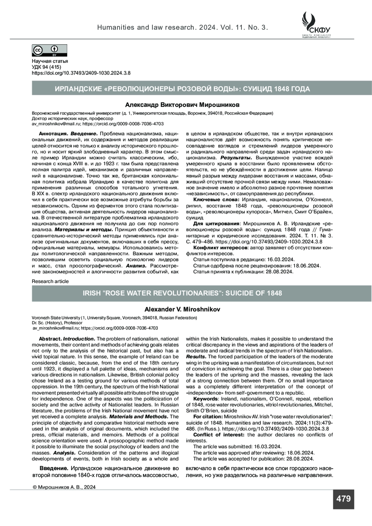 МИРОШНИКОВ А. В. ИРЛАНДСКИЕ «РЕВОЛЮЦИОНЕРЫ РОЗОВОЙ ВОДЫ»: СУИЦИД 1848 ГОДА // ГУМАНИТАРНЫЕ И ЮРИДИЧЕСКИЕ ИССЛЕДОВАНИЯ. 2024. ТОМ 11, № 3
