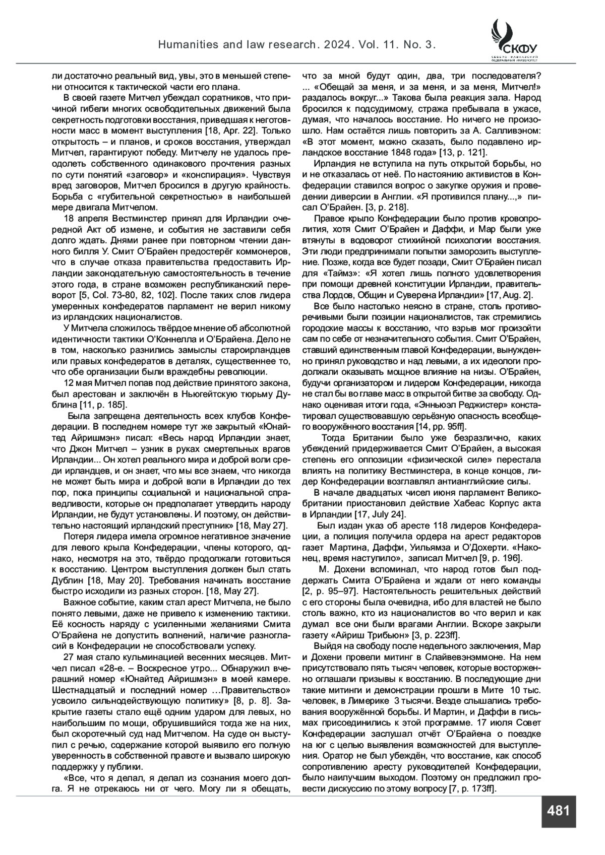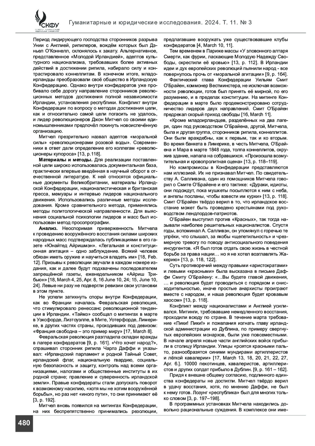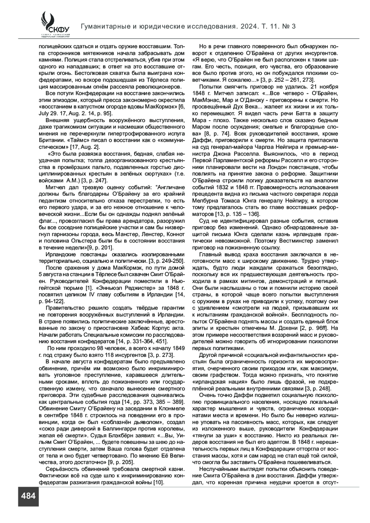 МИРОШНИКОВ А. В. ИРЛАНДСКИЕ «РЕВОЛЮЦИОНЕРЫ РОЗОВОЙ ВОДЫ»: СУИЦИД 1848 ГОДА // ГУМАНИТАРНЫЕ И ЮРИДИЧЕСКИЕ ИССЛЕДОВАНИЯ. 2024. ТОМ 11, № 3