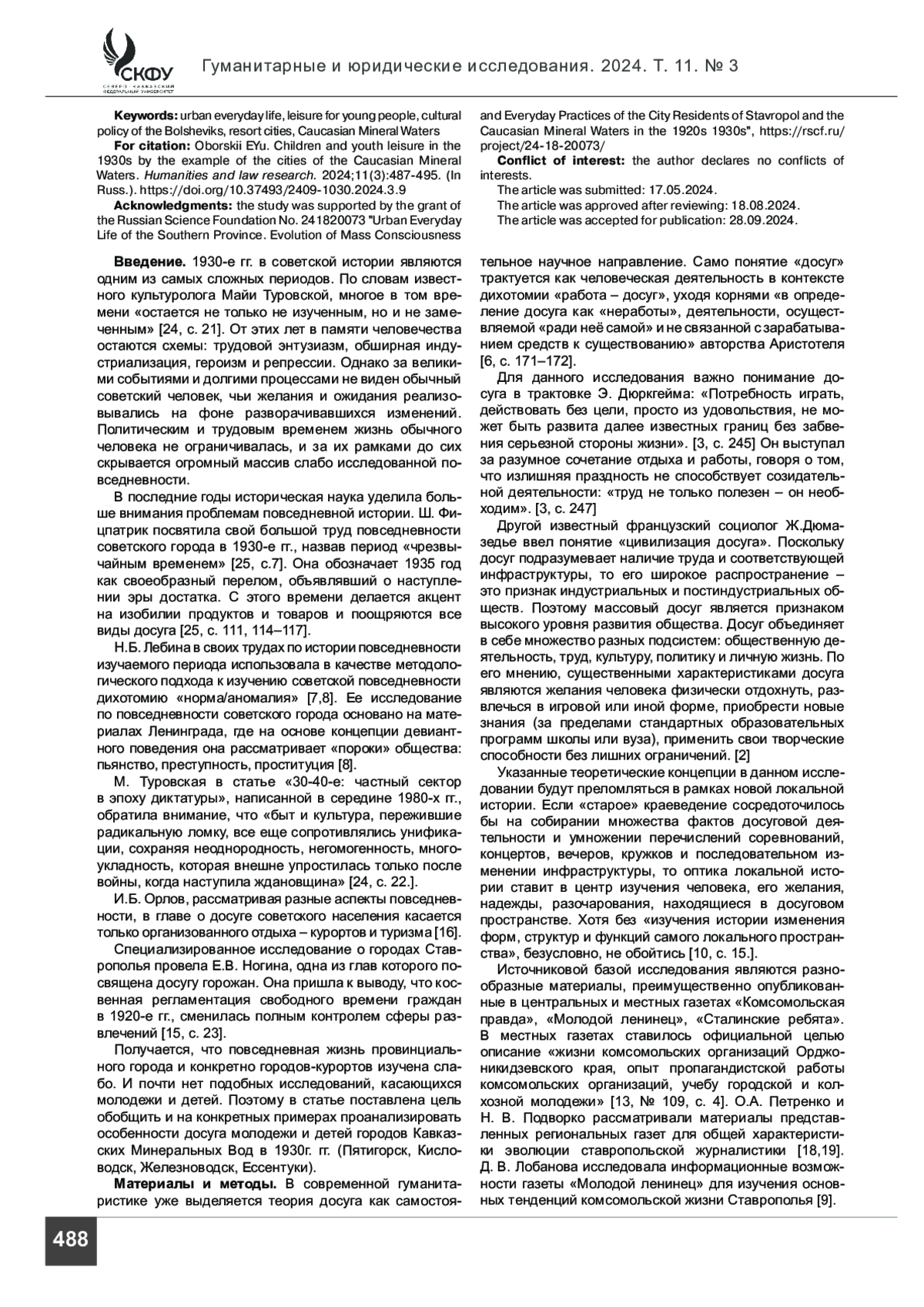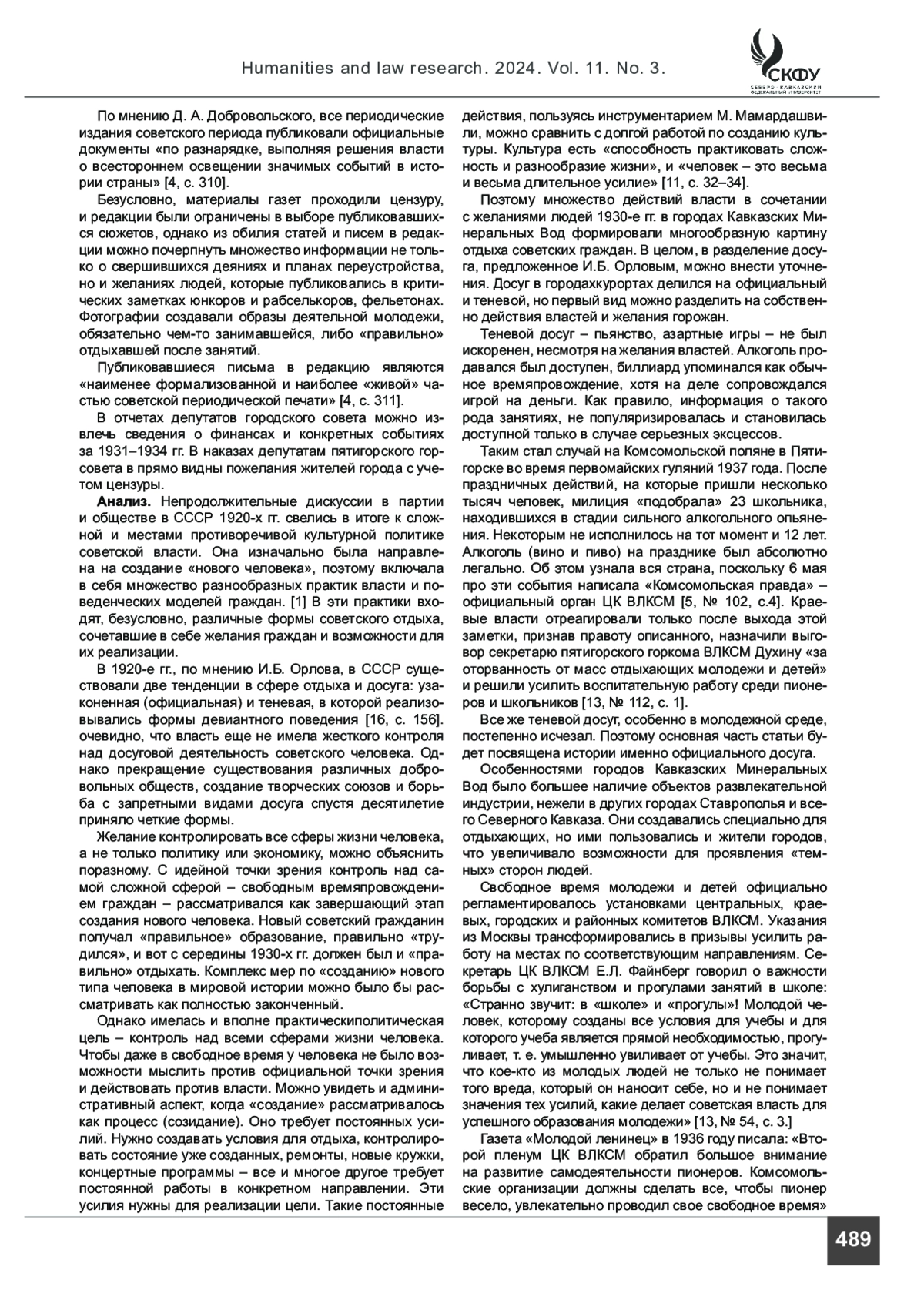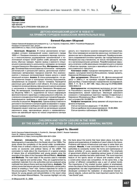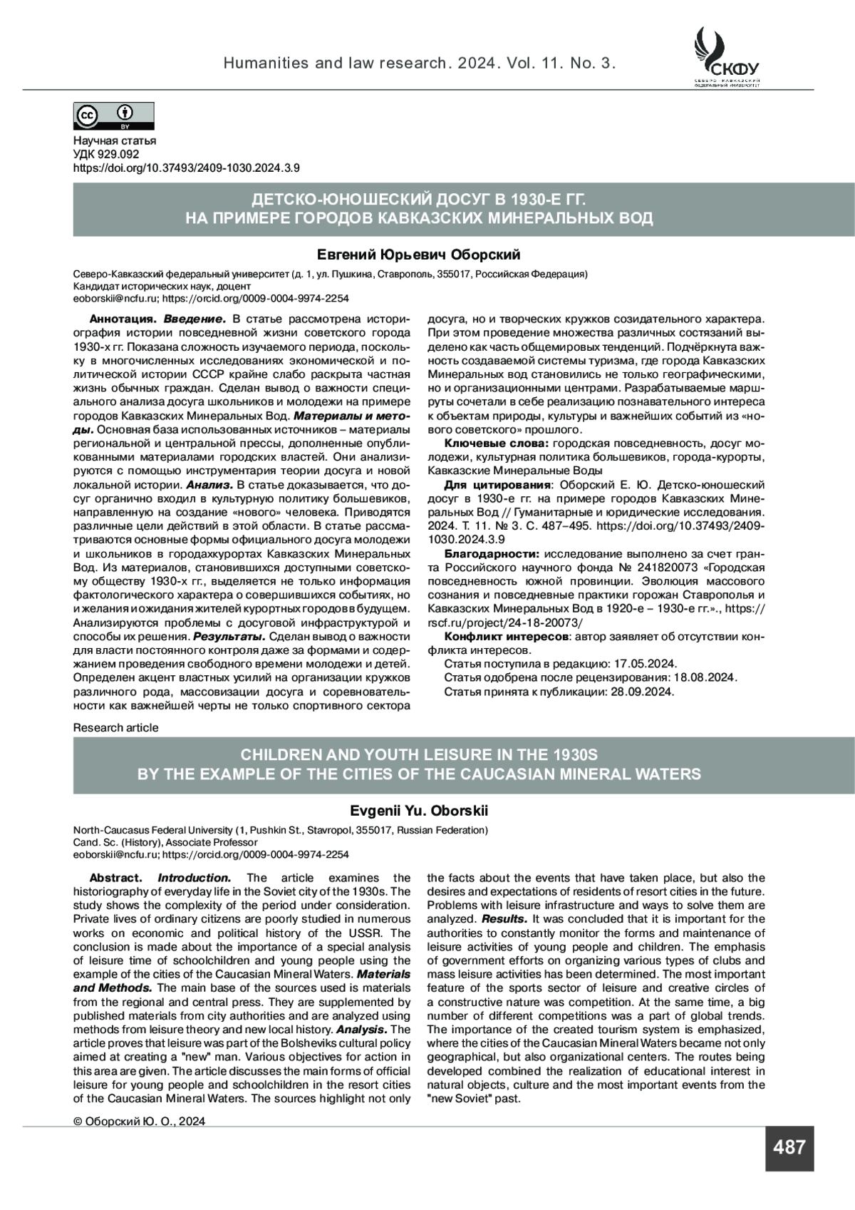 ОБОРСКИЙ Е. Ю. ДЕТСКО-ЮНОШЕСКИЙ ДОСУГ В 1930-Е ГГ. НА ПРИМЕРЕ ГОРОДОВ КАВКАЗСКИХ МИНЕРАЛЬНЫХ ВОД // ГУМАНИТАРНЫЕ И ЮРИДИЧЕСКИЕ ИССЛЕДОВАНИЯ. 2024. ТОМ 11, № 3