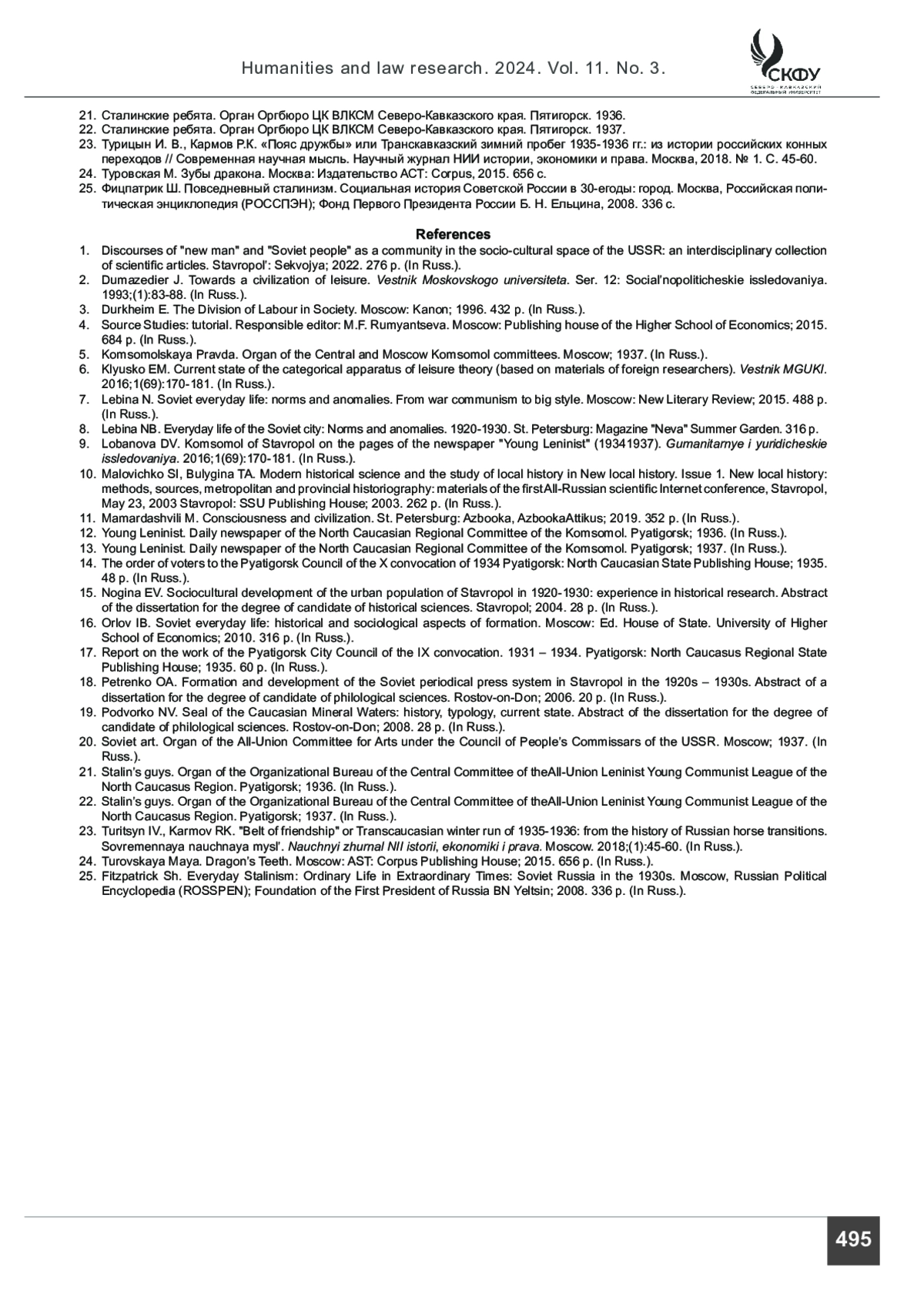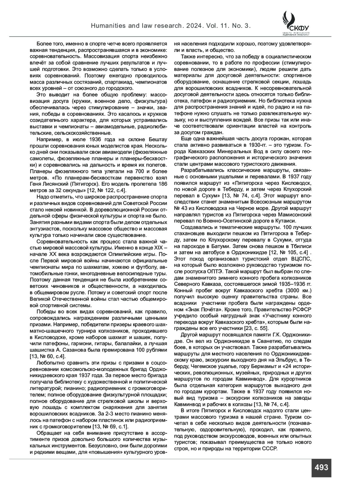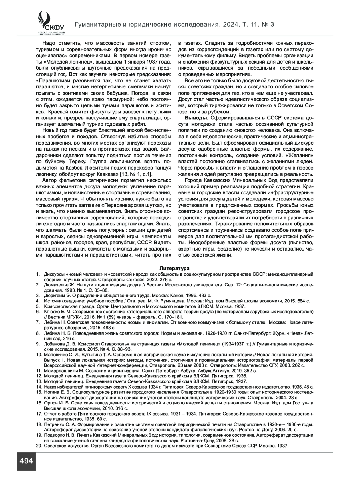 ОБОРСКИЙ Е. Ю. ДЕТСКО-ЮНОШЕСКИЙ ДОСУГ В 1930-Е ГГ. НА ПРИМЕРЕ ГОРОДОВ КАВКАЗСКИХ МИНЕРАЛЬНЫХ ВОД // ГУМАНИТАРНЫЕ И ЮРИДИЧЕСКИЕ ИССЛЕДОВАНИЯ. 2024. ТОМ 11, № 3