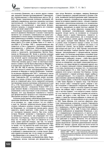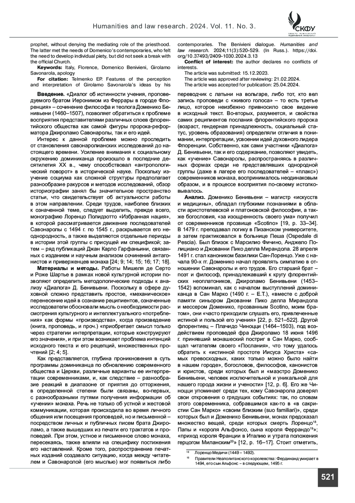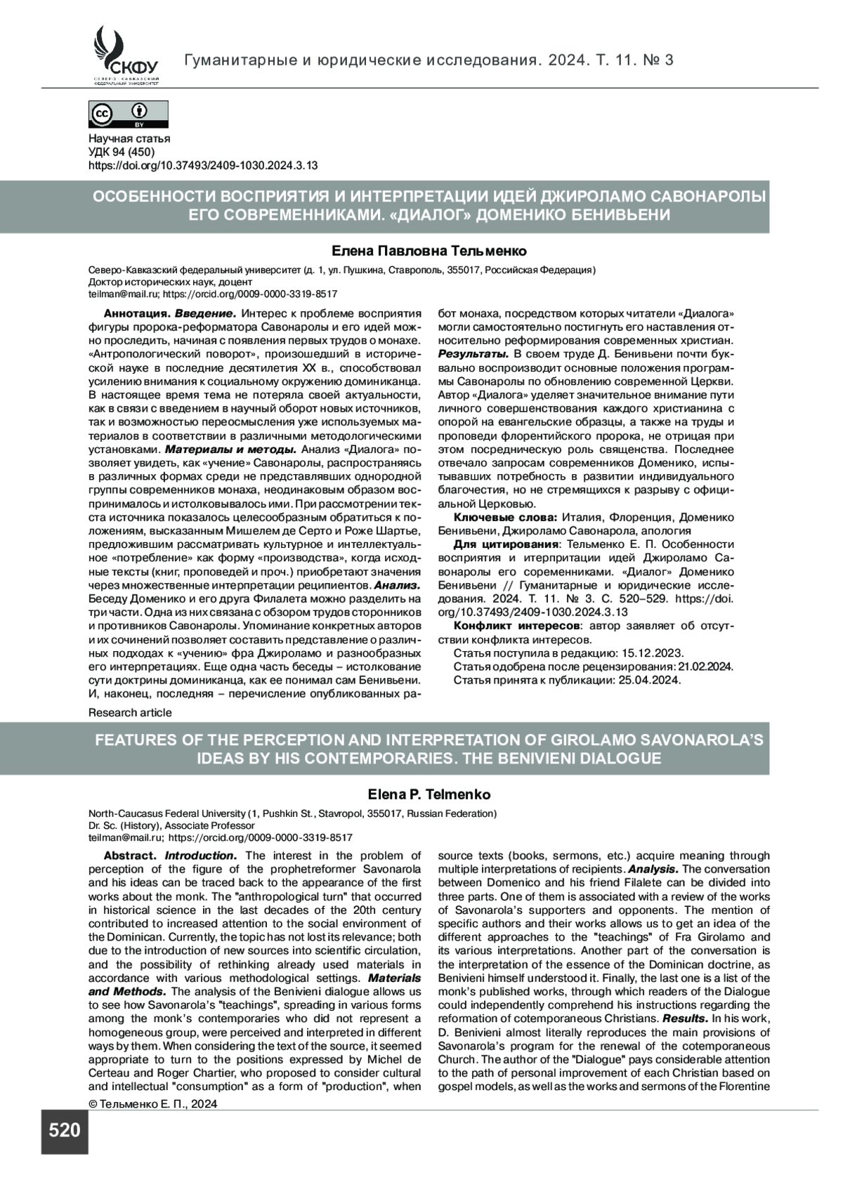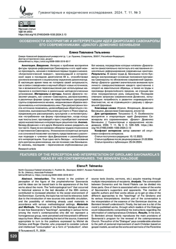 ТЕЛЬМЕНКО Е. П. ОСОБЕННОСТИ ВОСПРИЯТИЯ И ИТЕРПРИТАЦИИ ИДЕЙ ДЖИРОЛАМО САВОНАРОЛЫ ЕГО СОРЕМЕННИКАМИ. «ДИАЛОГ» ДОМЕНИКО БЕНИВЬЕНИ // ГУМАНИТАРНЫЕ И ЮРИДИЧЕСКИЕ ИССЛЕДОВАНИЯ. 2024. ТОМ 11, № 3