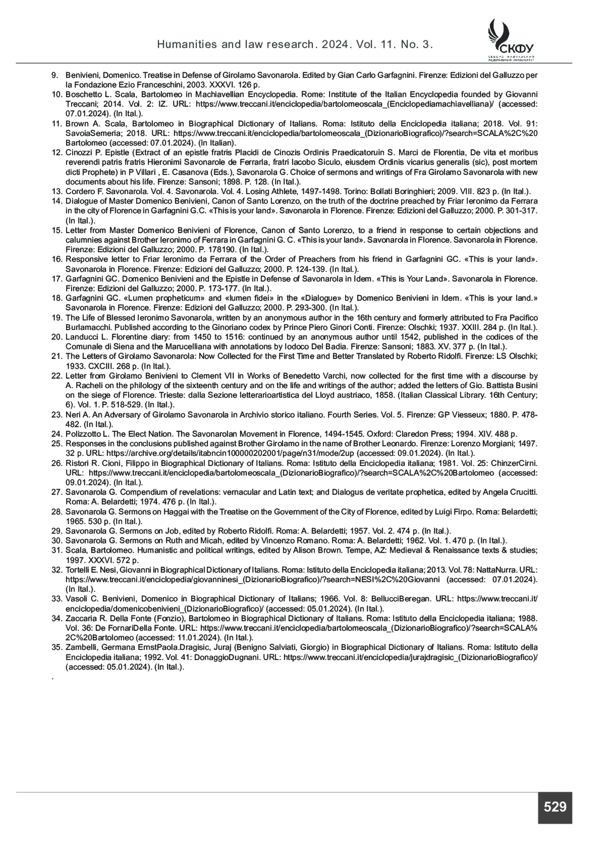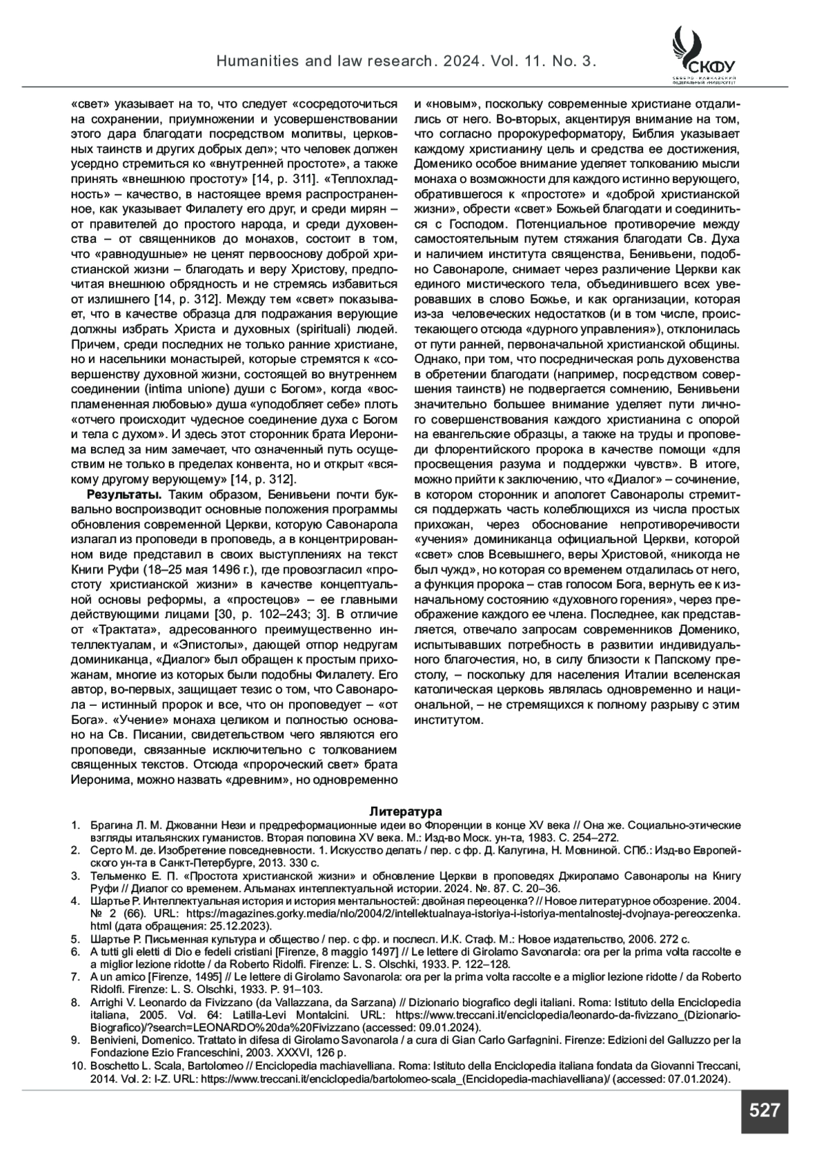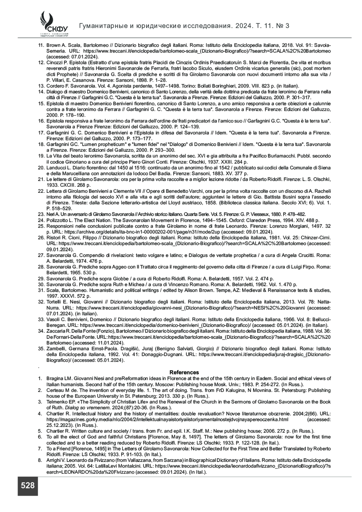ТЕЛЬМЕНКО Е. П. ОСОБЕННОСТИ ВОСПРИЯТИЯ И ИТЕРПРИТАЦИИ ИДЕЙ ДЖИРОЛАМО САВОНАРОЛЫ ЕГО СОРЕМЕННИКАМИ. «ДИАЛОГ» ДОМЕНИКО БЕНИВЬЕНИ // ГУМАНИТАРНЫЕ И ЮРИДИЧЕСКИЕ ИССЛЕДОВАНИЯ. 2024. ТОМ 11, № 3