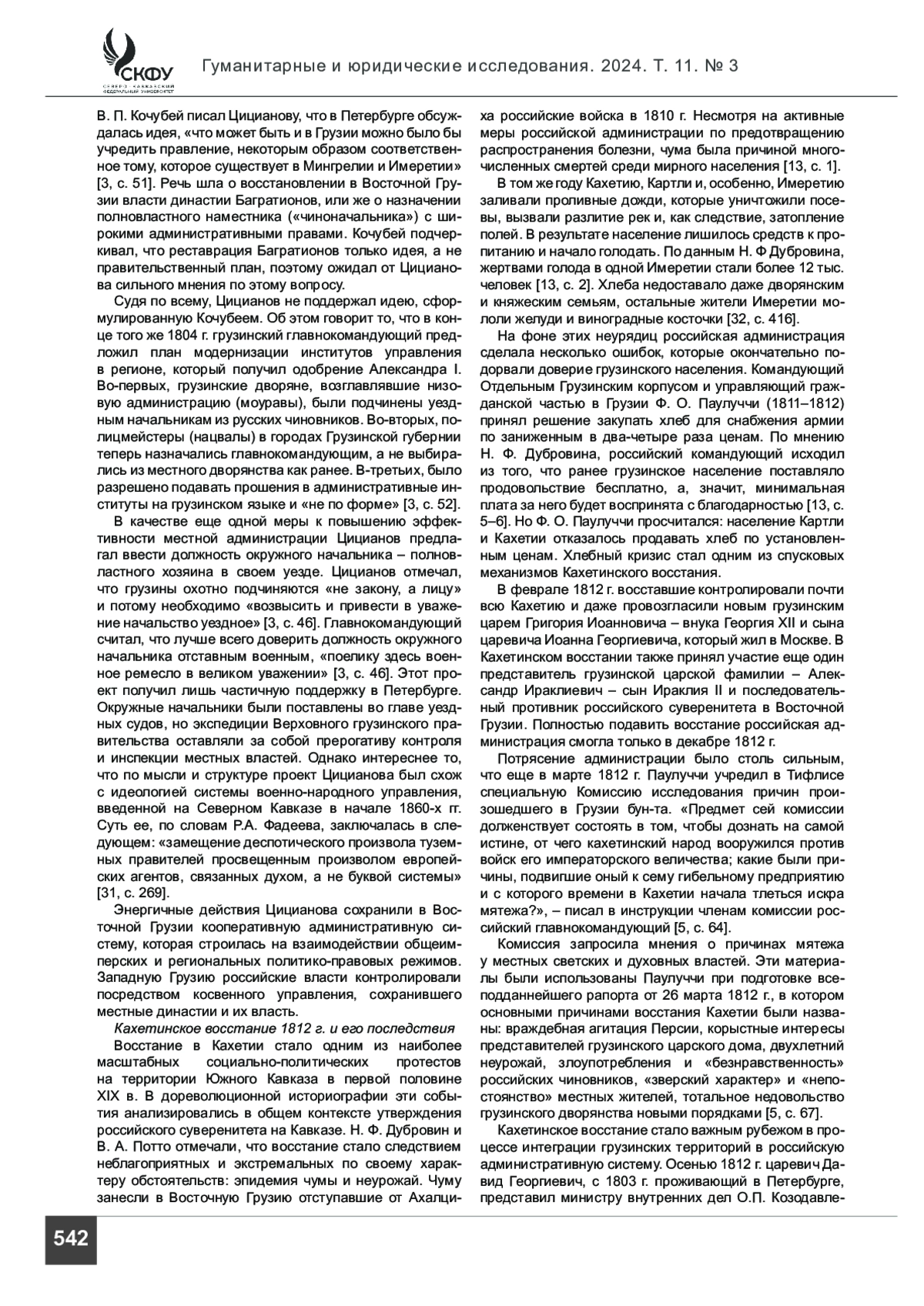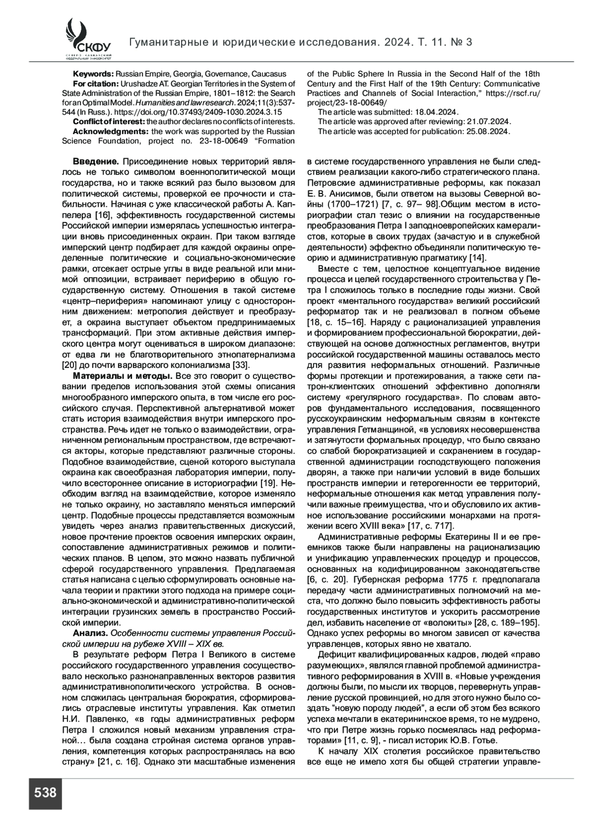 Введение. Статья посвящена анализу процесса административно-политической интеграции грузинских территорий в пространство Российской империи. Рассматриваемый хронологический период (1801–1812 гг.) охватывает время от вхождения в состав Российского государства Восточной Грузии (Картли-Кахетии) до Кахетинского восстания 1812 г.