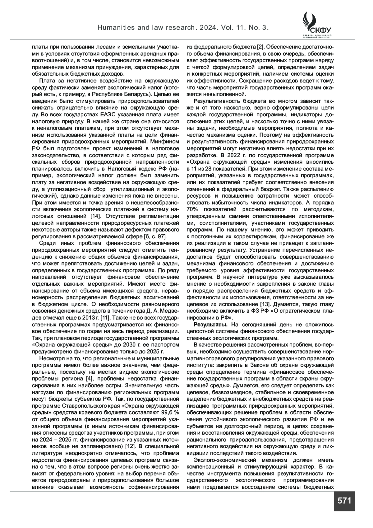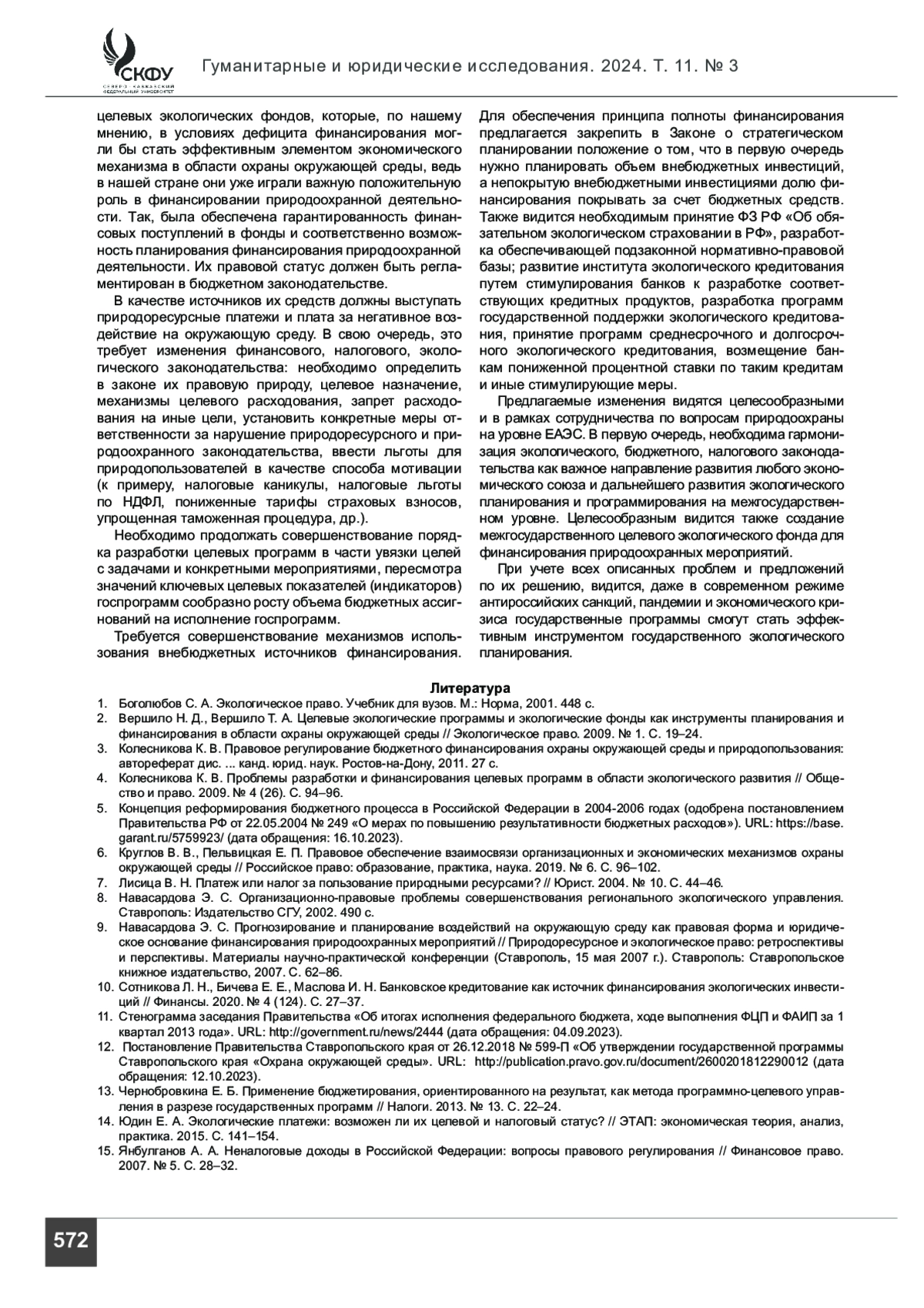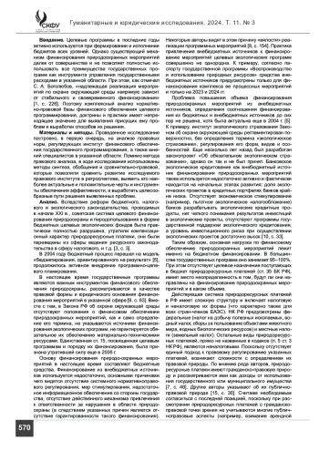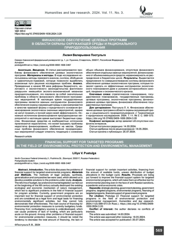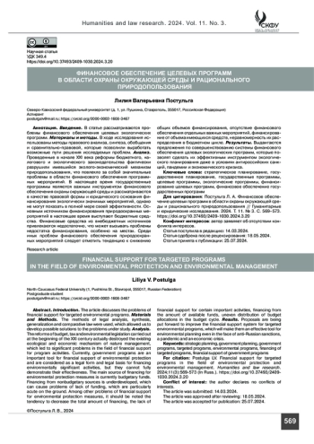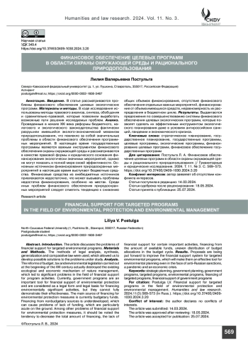 ПОСТУЛЬГА Л. В. ФИНАНСОВОЕ ОБЕСПЕЧЕНИЕ ЦЕЛЕВЫХ ПРОГРАММ В ОБЛАСТИ ОХРАНЫ ОКРУЖАЮЩЕЙ СРЕДЫ И РАЦИОНАЛЬНОГО ПРИРОДОПОЛЬЗОВАНИЯ // ГУМАНИТАРНЫЕ И ЮРИДИЧЕСКИЕ ИССЛЕДОВАНИЯ. 2024. ТОМ 11, № 3