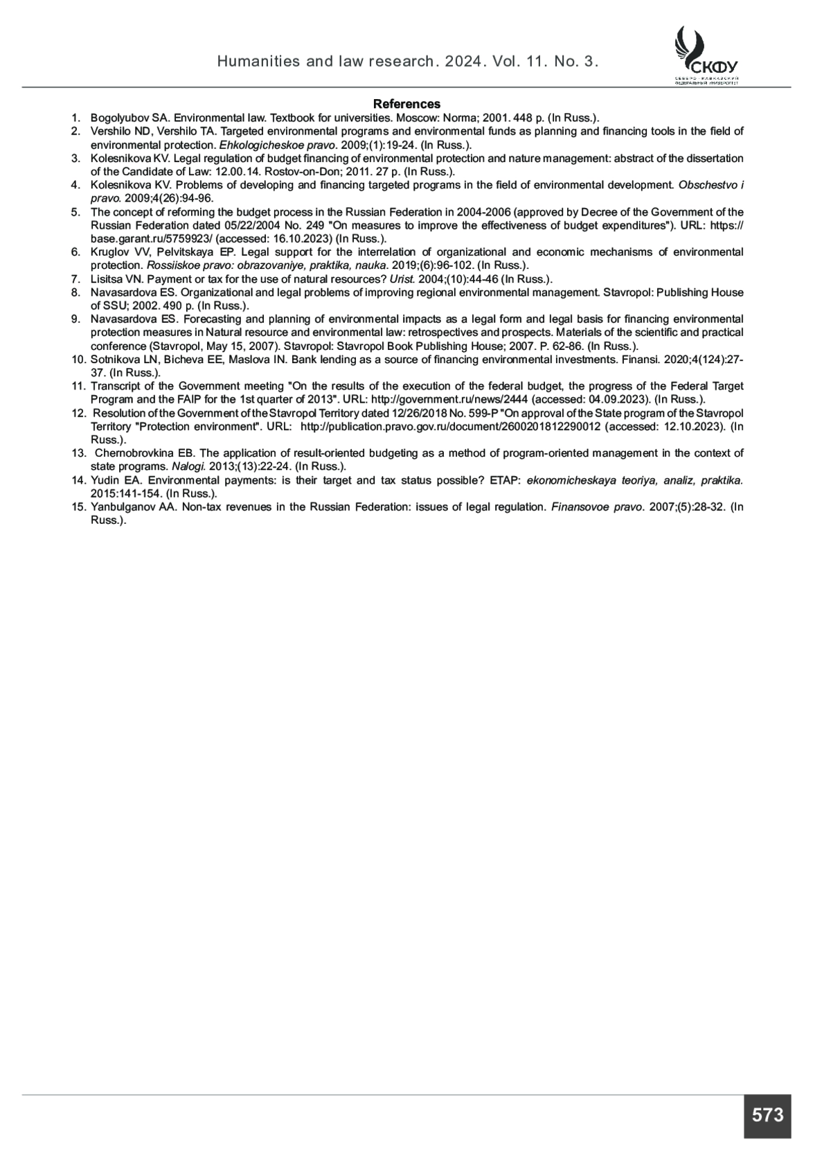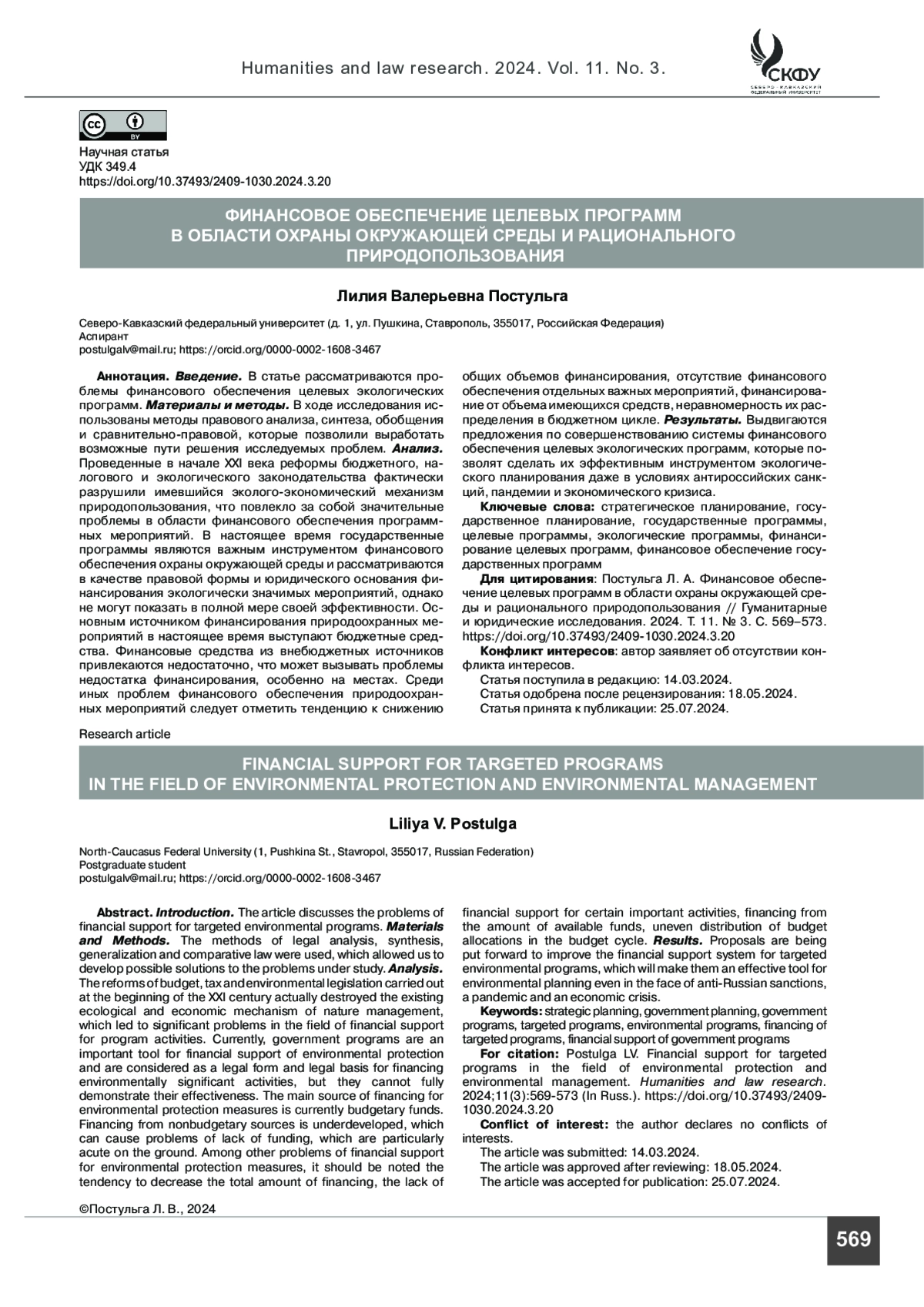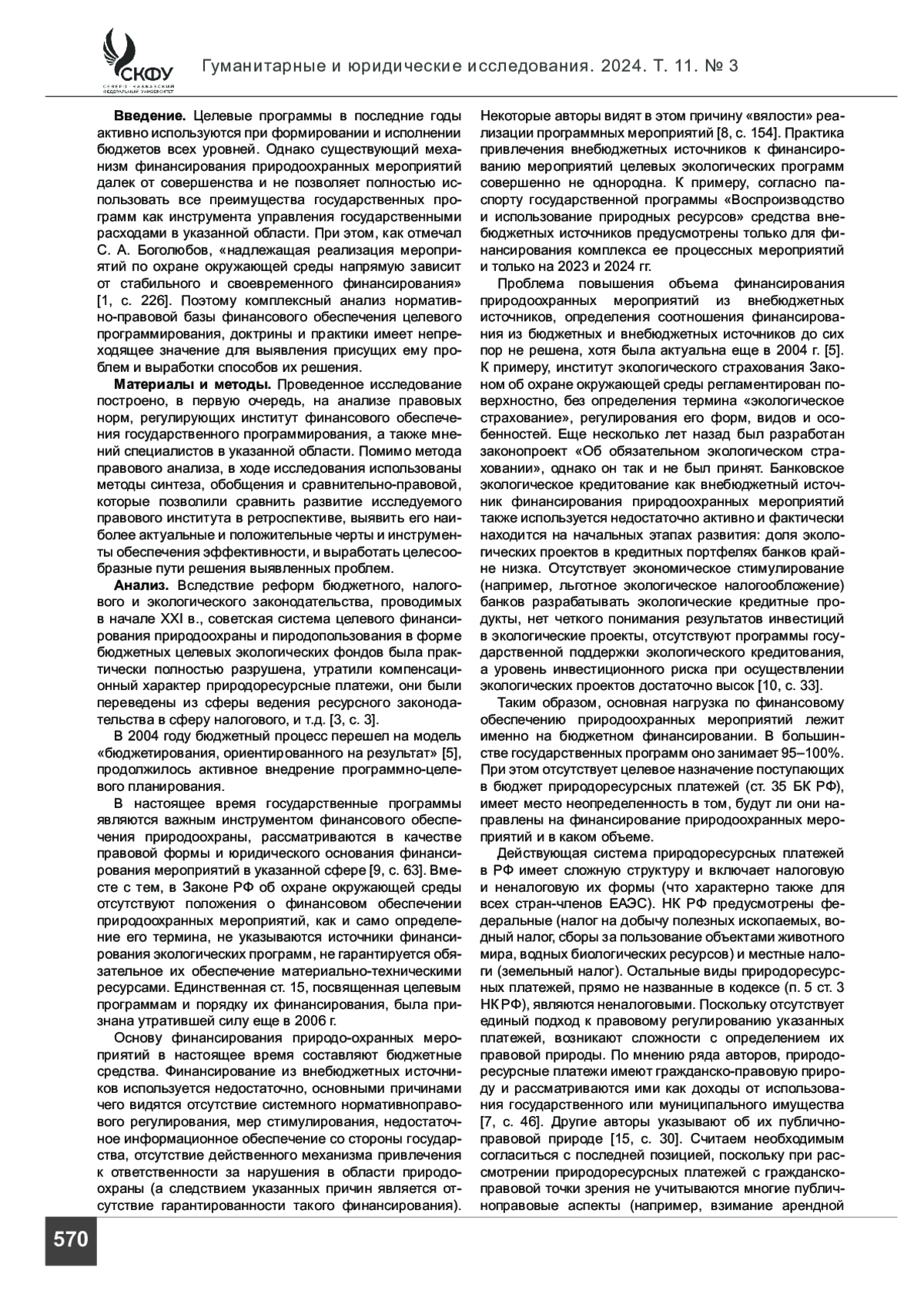 ПОСТУЛЬГА Л. В. ФИНАНСОВОЕ ОБЕСПЕЧЕНИЕ ЦЕЛЕВЫХ ПРОГРАММ В ОБЛАСТИ ОХРАНЫ ОКРУЖАЮЩЕЙ СРЕДЫ И РАЦИОНАЛЬНОГО ПРИРОДОПОЛЬЗОВАНИЯ // ГУМАНИТАРНЫЕ И ЮРИДИЧЕСКИЕ ИССЛЕДОВАНИЯ. 2024. ТОМ 11, № 3