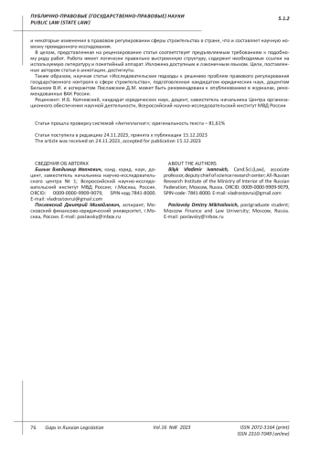 6. Подъяблонская Л.Д. “Теоретические основы государственного контроля и надзора в сфере строительной деятельности” // Вестник науки и образования. 2022. №9 (129).
