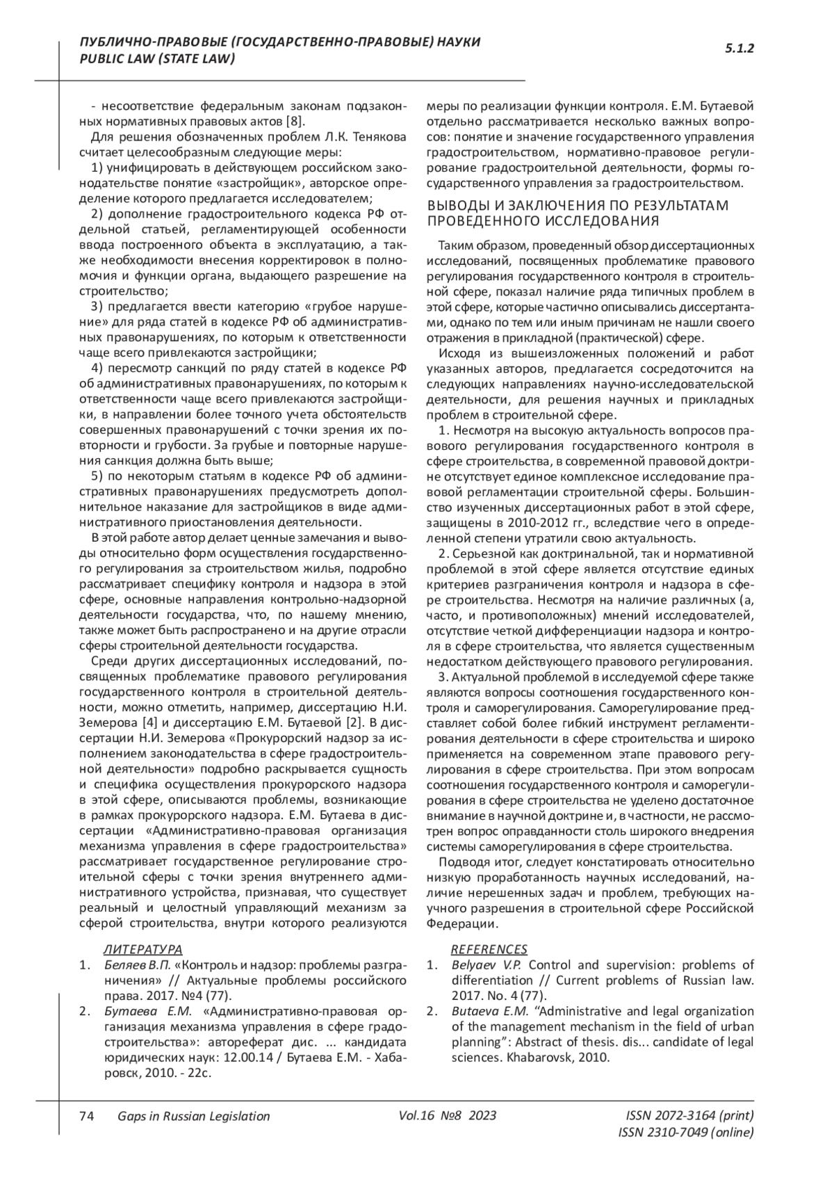 1. Беляев В.П. “Контроль и надзор: проблемы разграничения” // Актуальные проблемы российского права. 2017. №4 (77).