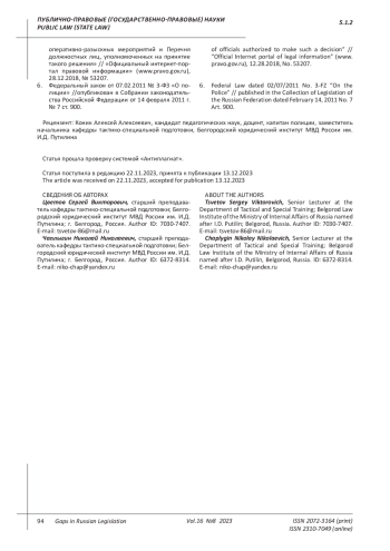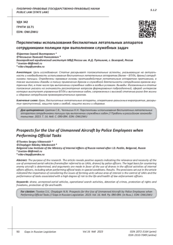 Статья: ПЕРСПЕКТИВЫ ИСПОЛЬЗОВАНИЯ БЕСПИЛОТНЫХ ЛЕТАТЕЛЬНЫХ АППАРАТОВ СОТРУДНИКАМИ ПОЛИЦИИ ПРИ ВЫПОЛНЕНИИ СЛУЖЕБНЫХ ЗАДАЧ (2023)