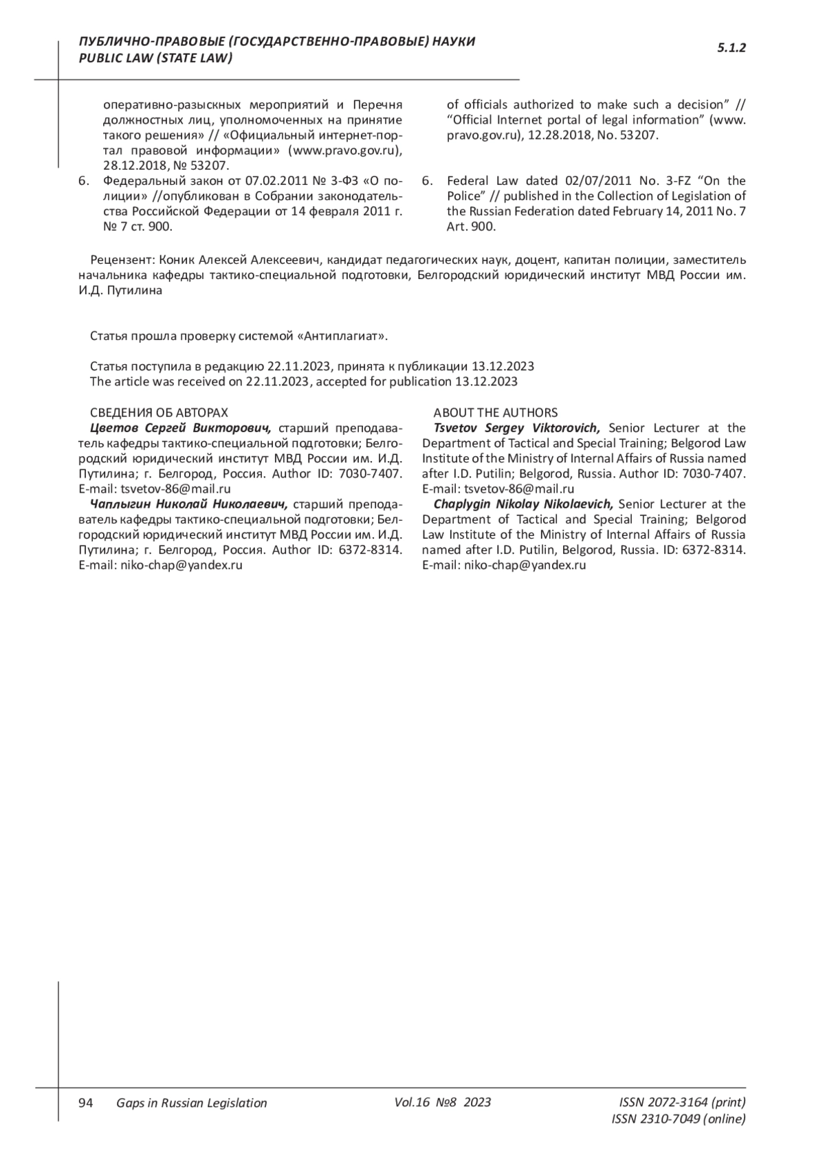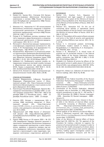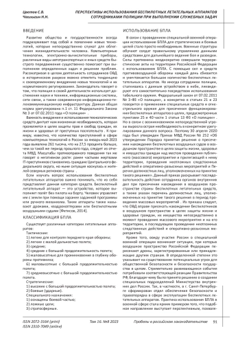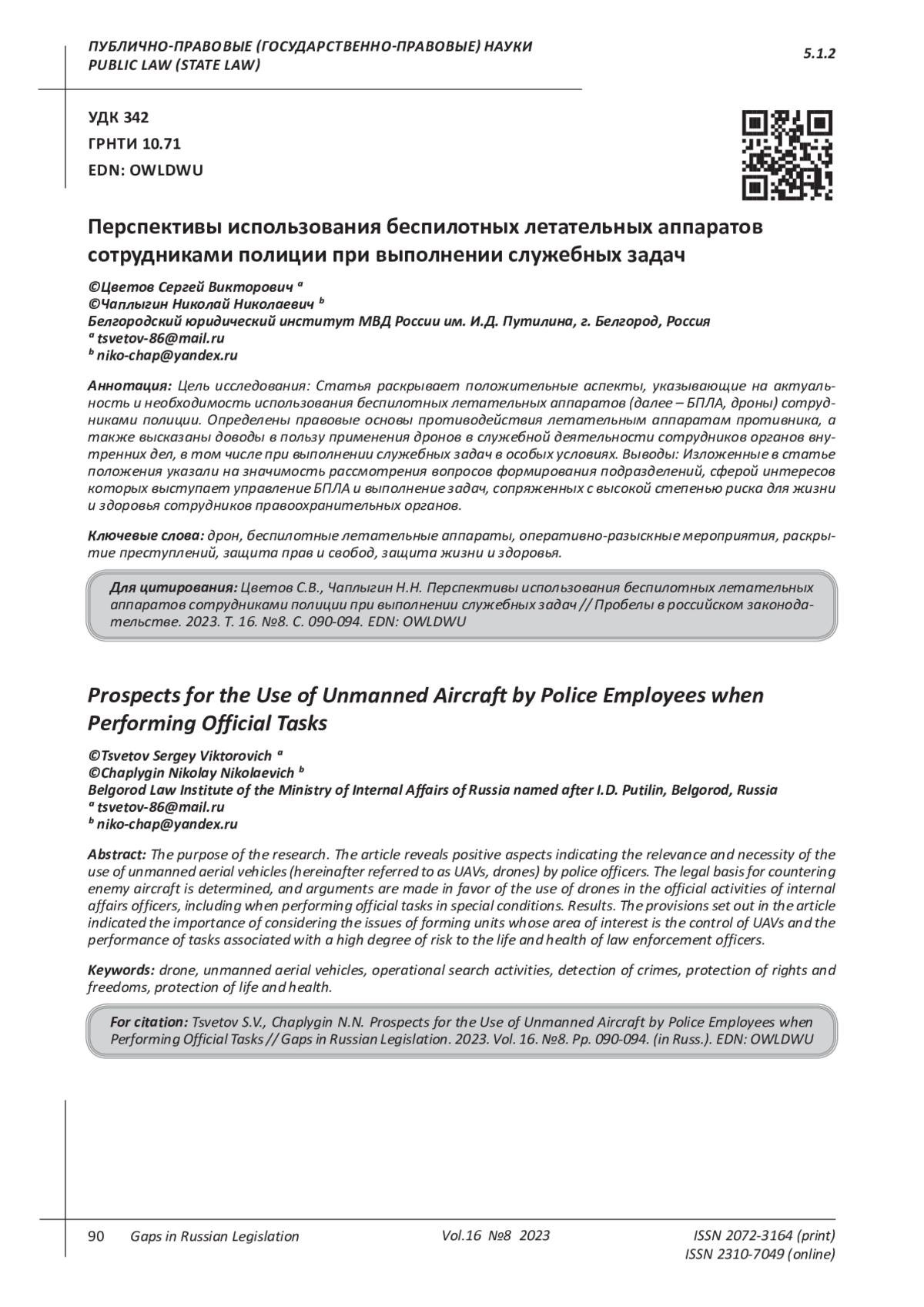ЦВЕТОВ С. В., ЧАПЛЫГИН Н. Н. ПЕРСПЕКТИВЫ ИСПОЛЬЗОВАНИЯ БЕСПИЛОТНЫХ ЛЕТАТЕЛЬНЫХ АППАРАТОВ СОТРУДНИКАМИ ПОЛИЦИИ ПРИ ВЫПОЛНЕНИИ СЛУЖЕБНЫХ ЗАДАЧ // ПРОБЕЛЫ В РОССИЙСКОМ ЗАКОНОДАТЕЛЬСТВЕ. 2023. Т. 16 № 8 (36 СТ.)