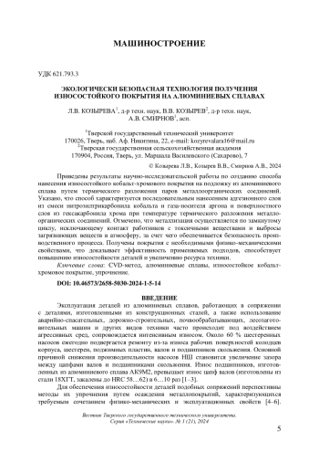Приведены результаты научно-исследовательской работы по созданию способа нанесения износостойкого кобальт-хромового покрытия на подложку из алюминиевого сплава путем термического разложения паров металлоорганических соединений. Указано, что способ характеризуется последовательным нанесением адгезионного слоя из смеси нитрозилтрикарбонила кобальта и газа-носителя аргона и поверхностного слоя из гексакарбонила хрома при температуре термического разложения металлоорганических соединений. Отмечено, что металлизация осуществляется по замкнутому циклу, исключающему контакт работников с токсичными веществами и выбросы загрязняющих веществ в атмосферу, за счет чего обеспечивается безопасность производственного процесса. Получены покрытия с необходимыми физико-механическими свойствами, что доказывает эффективность применяемых подходов, способствует повышению износостойкости деталей и увеличению ресурса техники