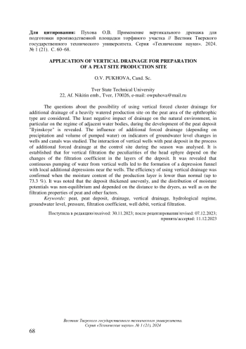 Рассмотрены вопросы о возможности использования вертикального принудительного кустового дренирования для дополнительного осушения сильнообводненной производственной площадки на торфяном участке эфтрофного типа. Выявлено наименьшее отрицательное воздействие дренирования на окружающую природную среду, в частности на режим прилегающих водных объектов, при отработке торфяного месторождения «Ильинское». Изучено влияние дополнительного принудительного осушения (в зависимости от осадков и объема откачанной воды) на показатели изменения уровней грунтовых вод в скважинах и каналах. Проанализировано взаимодействие вертикальных скважин с торфяной залежью в процессе дополнительного принудительного осушения на контрольном участке в течение сезона. Установлено, что для вертикальной фильтрации особенности эпюры напоров зависят от изменений коэффициента фильтрации в слоях залежи. Выявлено, что непрерывная откачка воды из вертикальных скважин привела к образованию депрессионной воронки с местными дополнительными понижениями вблизи скважин. Подтверждена эффективность использования вертикального дренирования при понижении влажности эксплуатационного слоя ниже нормы (до 73,3 %). Отмечено, что по толщине залежь уплотнилась неравномерно, а распределение потенциалов влаги было неравновесным и зависело от расстояния до осушителей, а также от фильтрационных свойств торфа и других факторов