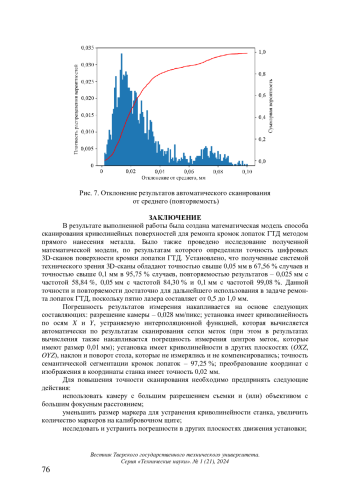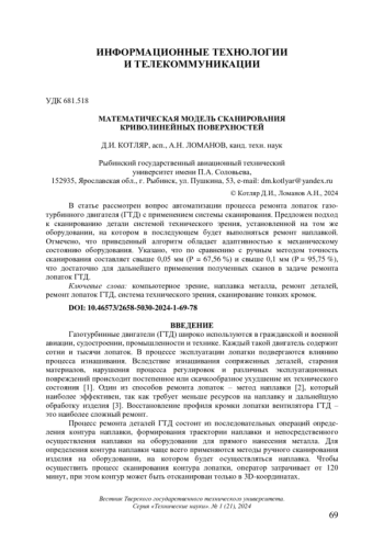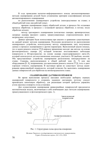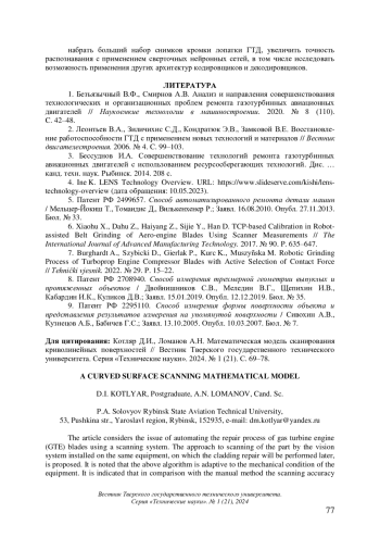 В статье рассмотрен вопрос автоматизации процесса ремонта лопаток газотурбинного двигателя (ГТД) с применением системы сканирования. Предложен подход к сканированию детали системой технического зрения, установленной на том же оборудовании, на котором в последующем будет выполняться ремонт наплавкой. Отмечено, что приведенный алгоритм обладает адаптивностью к механическому состоянию оборудования. Указано, что по сравнению с ручным методом точность сканирования составляет свыше 0,05 мм (P = 67,56 %) и свыше 0,1 мм (P = 95,75 %), что достаточно для дальнейшего применения полученных сканов в задаче ремонта лопаток ГТД