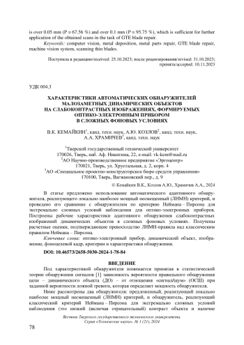 В статье предложено использование автоматического адаптивного обнаружителя, реализующего локально наиболее мощный несмещенный (ЛНМН) критерий, и проведено его сравнение с обнаружителем по критерию Неймана ‒ Пирсона для экстремально сложных условий наблюдения для оптико-электронных приборов. Построены рабочие характеристики адаптивного обнаружения слабоконтрастных изображений динамических объектов в сложных фоновых условиях. Получены расчетные оценки, подтверждающие превосходство ЛНМН-правила над классическим правилом Неймана ‒ Пирсона