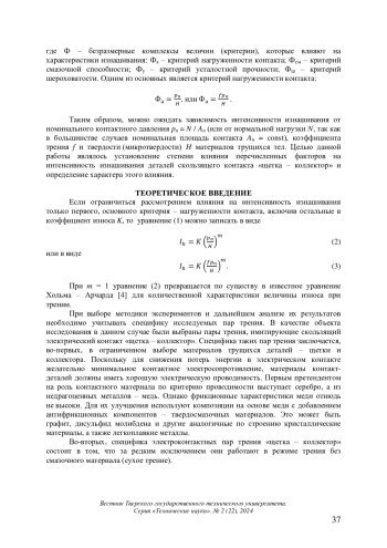 Процесс изнашивания при трении относится к cлучайным нестационарным процессам. Его случайный характер обусловлен влиянием на него многочисленных факторов, многие из которых сами по себе являются случайными величинами. Эти факторы можно условно разделить на внешние и внутренние. К числу первых относятся нагрузка на фрикционный контакт, скорость скольжения, параметры внешней среды, наличие или отсутствие смазочного материала и др. [1]. Основными внутренними факторами являются физико-механические свойства материалов контактирующих деталей, характеристики смазочного материала (при его наличии) и шероховатость поверхностей трения. В скользящих электрических контактах наряду с механическим изнашиванием происходит электроэрозионное изнашивание. К факторам, влияющим на этот вид изнашивания, относят плотность тока и коммутируемое напряжение