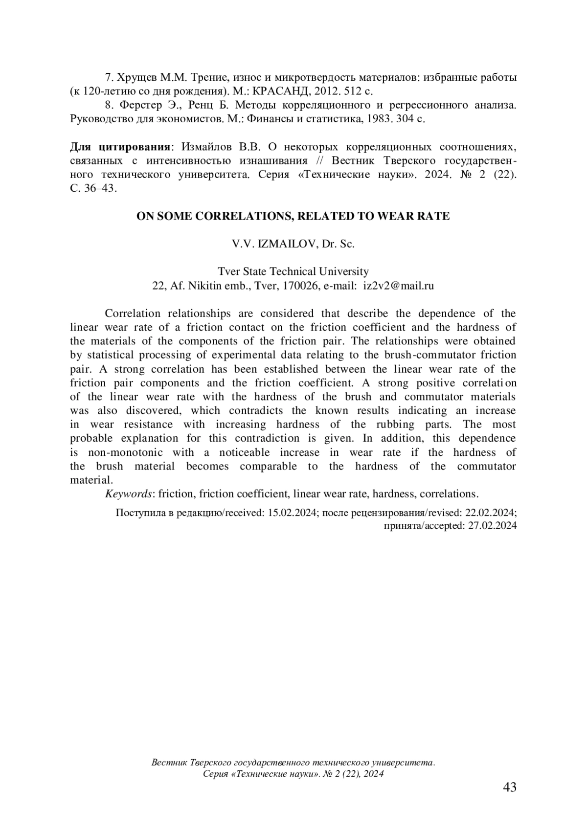 Рассмотрены корреляционные соотношения, описывающие зависимость линейной интенсивности изнашивания фрикционного контакта от коэффициента трения и твердости материалов компонентов пары трения. Соотношения получены статистической обработкой экспериментальных данных, относящихся к паре трения «щетка – коллектор». Установлена сильная корреляционная связь линейной интенсивности изнашивания компонентов пары трения с коэффициентом трения, а также обнаружена сильная положительная корреляция линейной интенсивности изнашивания с твердостью материалов щетки и коллектора, что противоречит известным результатам, свидетельствующим о возрастании износостойкости с увеличением твердости трущихся деталей. Приводится наиболее вероятное объяснение такого противоречия. Кроме того, указанная зависимость носит немонотонный характер с заметным возрастанием скорости изнашивания, если твердость материала щетки становится сравнимой с твердостью материала коллектора