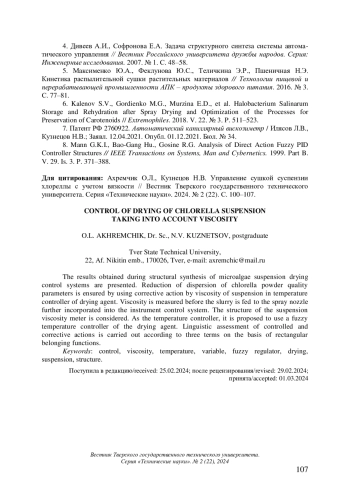 2. Ахремчик О.Л., Мурзахметов В.С. Моделирование роста штамма Chlorella Vulgaris в лабораторном биореакторе. Информационные технологии в моделировании и управлении: подходы, методы, решения: Материалы VI Всероссийской научн. конференции. Тольятти: ТГУ, 2023. С. 29-34. EDN: BCPZKI
