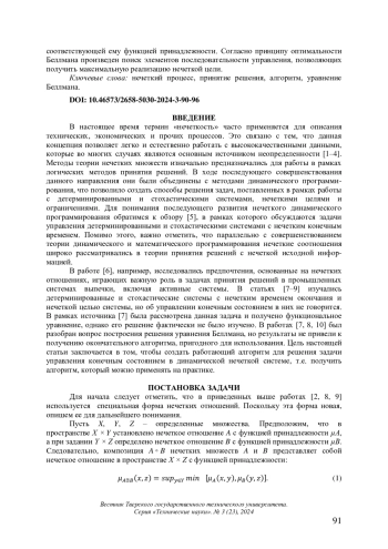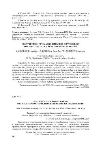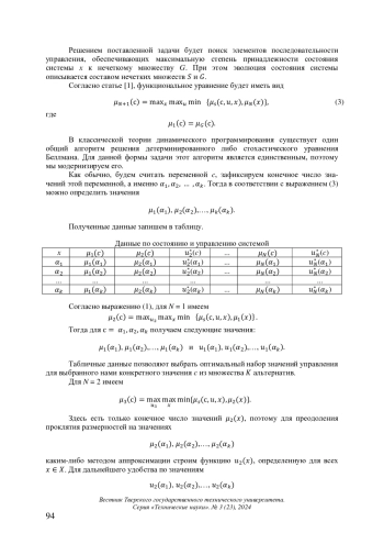В настоящее время термин «нечеткость» часто применяется для описания технических, экономических и прочих процессов. Это связано с тем, что данная концепция позволяет легко и естественно работать с высококачественными данными, которые во многих случаях являются основным источником неопределенности [1–4]. Методы теории нечетких множеств изначально предназначались для работы в рамках логических методов принятия решений. В ходе последующего совершенствования данного направления они были объединены с методами динамического программирования, что позволило создать способы решения задач, поставленных в рамках работы с детерминированными и стохастическими системами, нечеткими целями и ограничениями. Для понимания последующего развития нечеткого динамического программирования обратимся к обзору [5], в рамках которого обсуждаются задачи управления детерминированными и стохастическими системами с нечетким конечным временем. Помимо этого, важно отметить, что параллельно с совершенствованием теории динамического и математического программирования нечеткие соотношения широко рассматривались в теории принятия решений с нечеткой исходной информацией