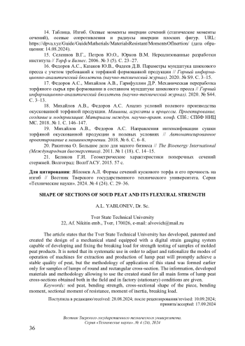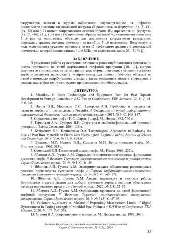 8. Яблонев А.Л., Гусева А.М. Определение энергоемкости процесса формования кускового торфа // Вестник Тверского государственного технического университета. Серия “Технические науки”. 2019. № 1. С. 36-45. EDN: XVISKJ