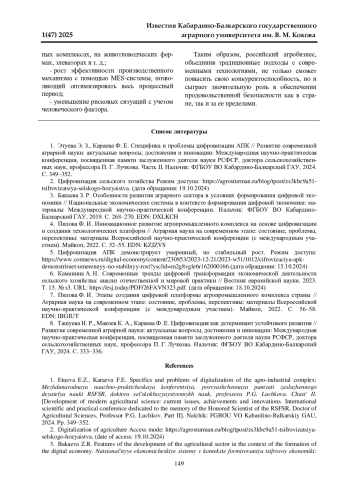 1. Этуева Э. З., Караева Ф. Е. Специфика и проблемы цифровизации АПК // Развитие современной аграрной науки: актуальные вопросы, достижения и инновации: Международная научно-практическая конференция, посвященная памяти заслуженного деятеля науки РСФСР, доктора сельскохозяйственных наук, профессора П. Г. Лучкова. Часть II. Нальчик: ФГБОУ ВО Кабардино-Балкарский ГАУ, 2024. С. 349-352. EDN: JRPRKG