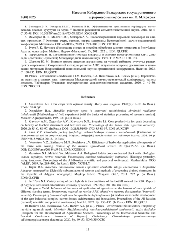 8. Перфильева Н. И. Сортоиспытание гибридов кукурузы в условиях предгорной зоны КБР // Доклады Адыгской (Черкесской) Международной академии наук. 1997. Т. 2. № 2. С. 180-183.