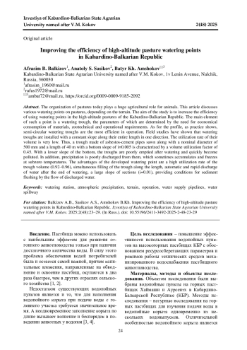 14. Принципы организации водопойных пунктов на пастбищах / А. С. Сасиков, А. Б. Балкизов, Б. Х. Амшоков [и др.] // Энергоресурсосбережение и энергоэффективность: актуальные вопросы, достижения и инновации: сб. науч. тр. II Международной научно-практической конференции. Нальчик, 2023. С. 235-239. EDN: ECQNAS