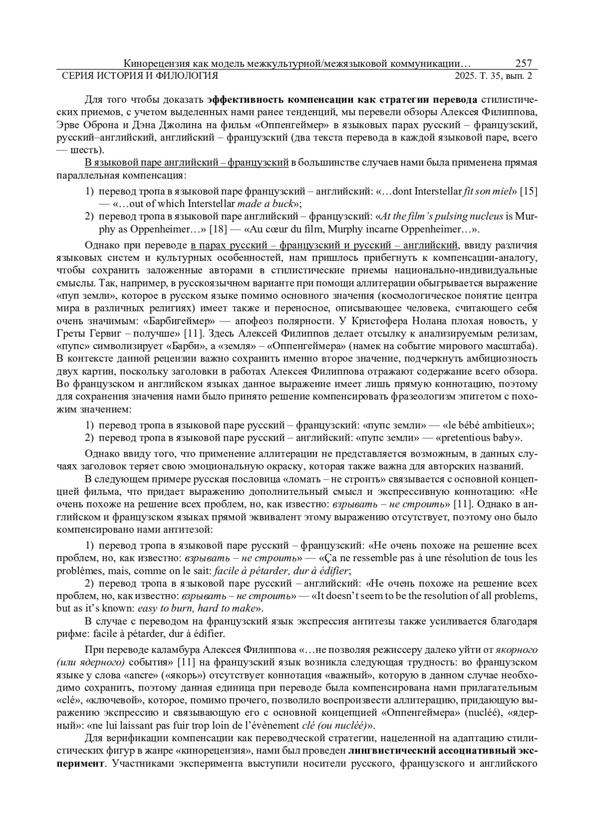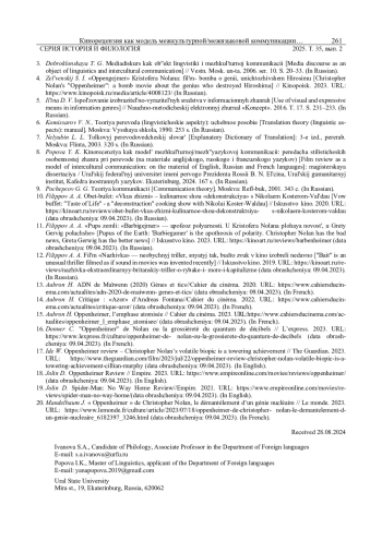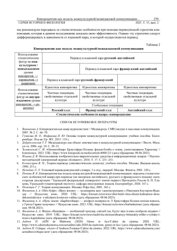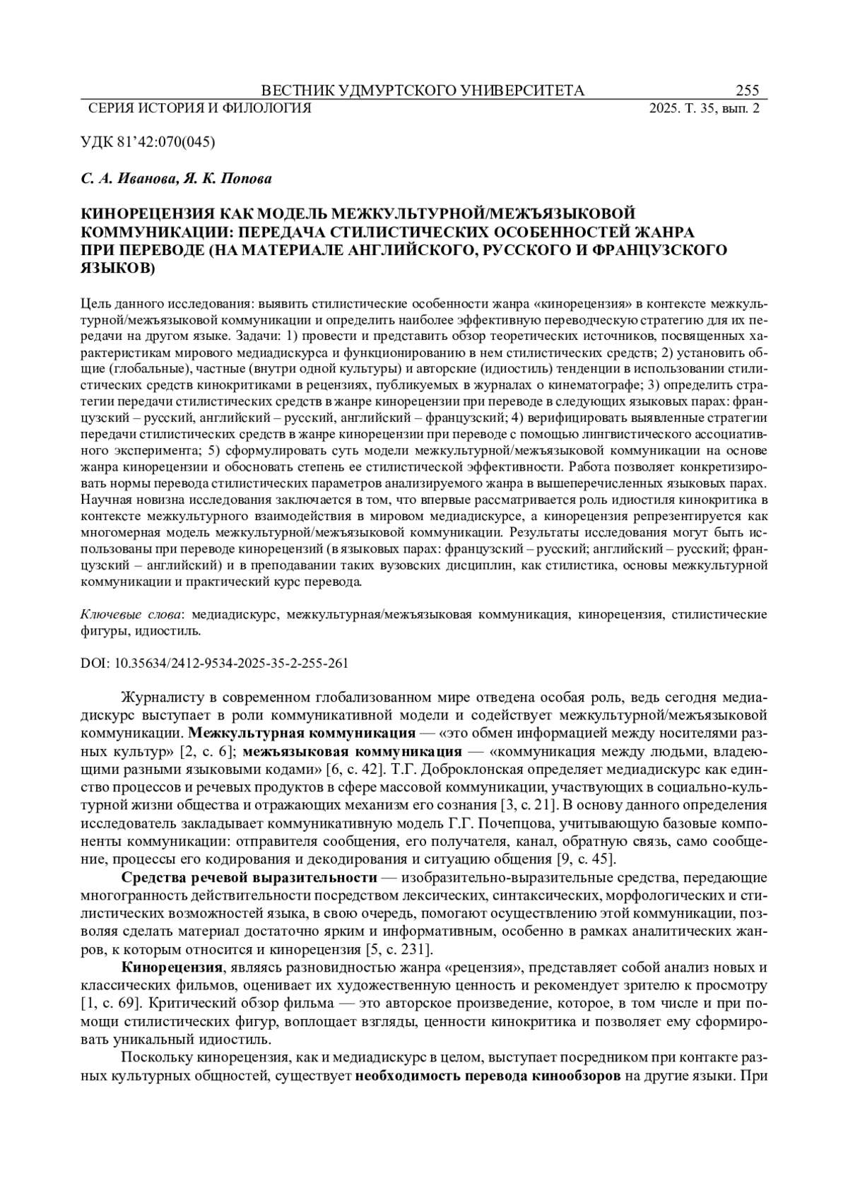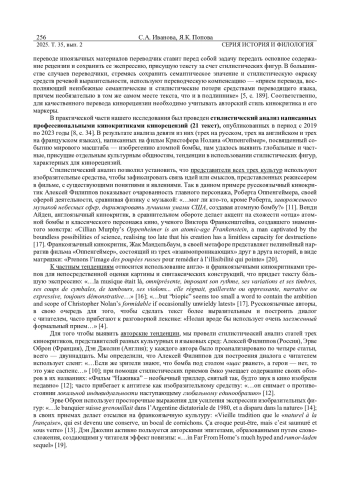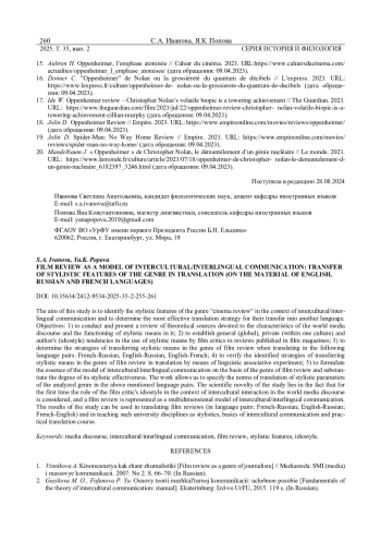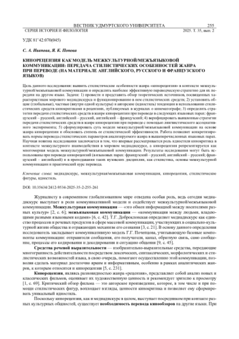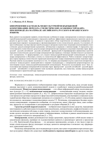 ИВАНОВА С. А., ПОПОВА Я. К. КИНОРЕЦЕНЗИЯ КАК МОДЕЛЬ МЕЖКУЛЬТУРНОЙ/МЕЖЪЯЗЫКОВОЙ КОММУНИКАЦИИ: ПЕРЕДАЧА СТИЛИСТИЧЕСКИХ ОСОБЕННОСТЕЙ ЖАНРА ПРИ ПЕРЕВОДЕ (НА МАТЕРИАЛЕ АНГЛИЙСКОГО, РУССКОГО И ФРАНЦУЗСКОГО ЯЗЫКОВ) // ВЕСТНИК УДМУРТСКОГО УНИВЕРСИТЕТА. СЕРИЯ: ИСТОРИЯ И ФИЛОЛОГИЯ. 2025. Т. 35 № 2