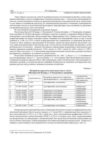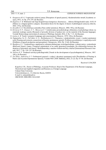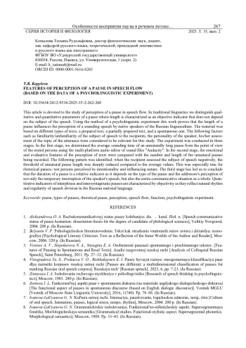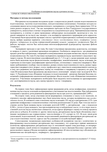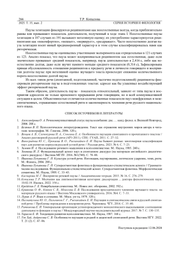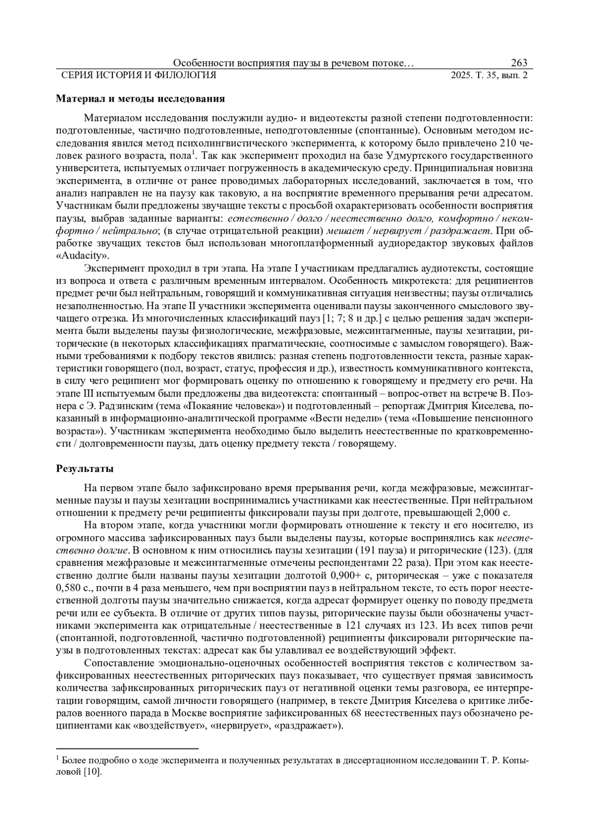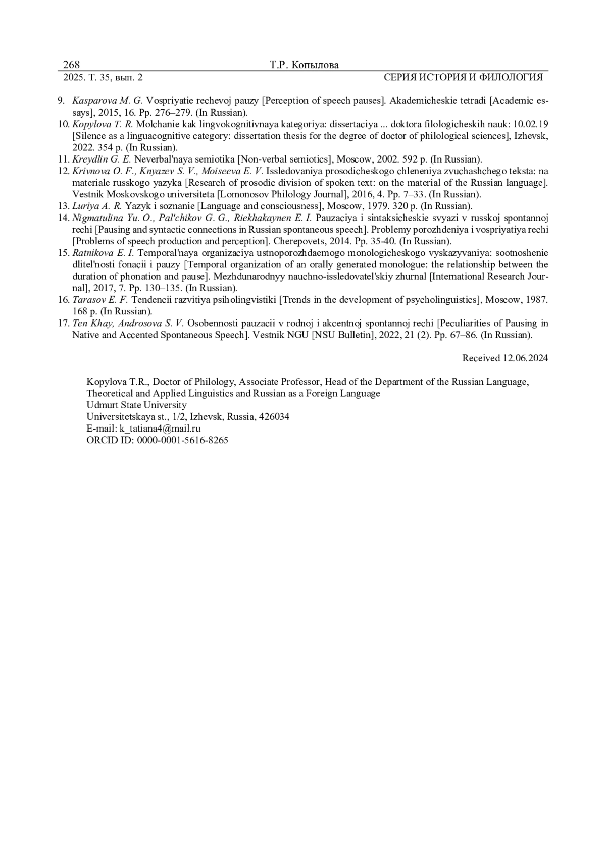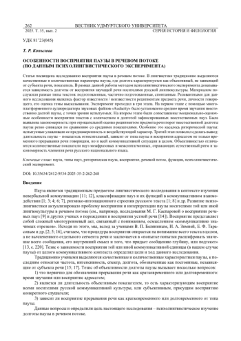 КОПЫЛОВА Т. Р. ОСОБЕННОСТИ ВОСПРИЯТИЯ ПАУЗЫ В РЕЧЕВОМ ПОТОКЕ (ПО ДАННЫМ ПСИХОЛИНГВИСТИЧЕСКОГО ЭКСПЕРИМЕНТА) // ВЕСТНИК УДМУРТСКОГО УНИВЕРСИТЕТА. СЕРИЯ: ИСТОРИЯ И ФИЛОЛОГИЯ. 2025. Т. 35 № 2