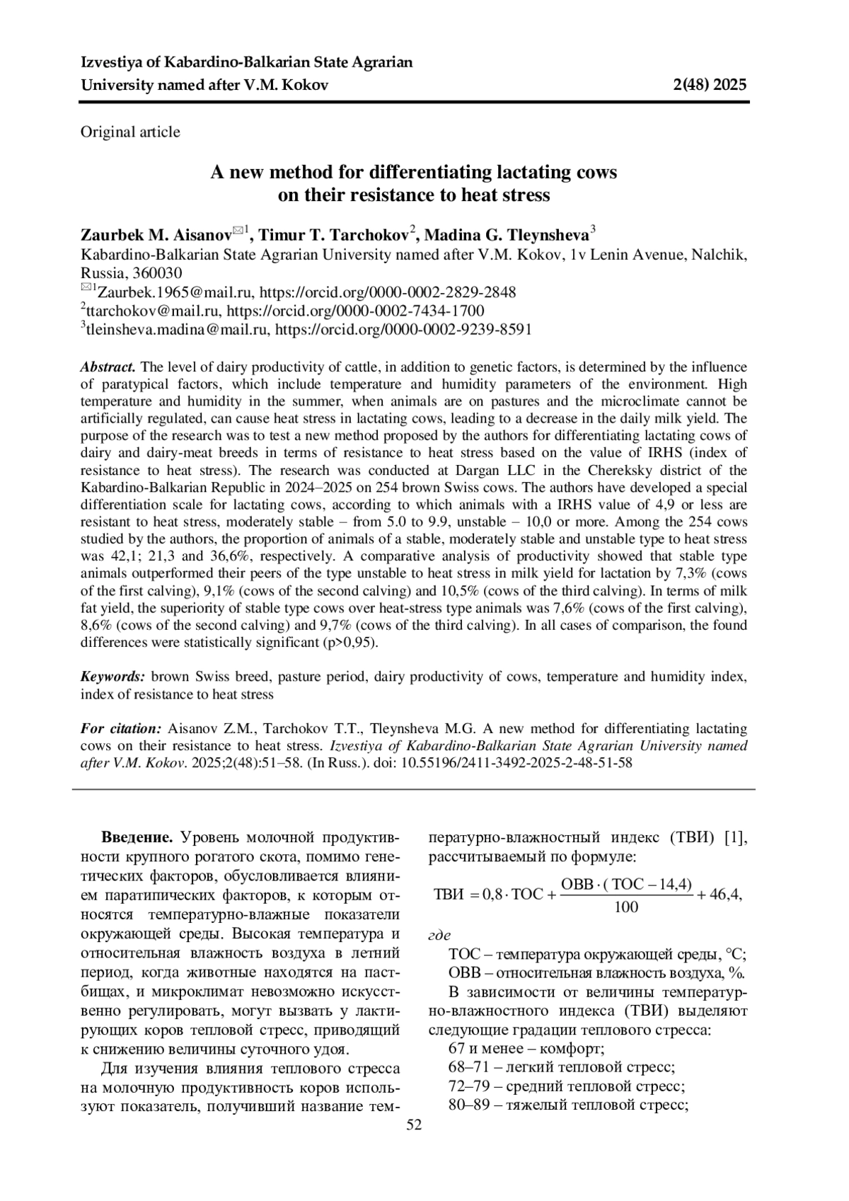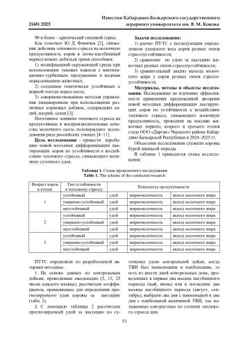 Уровень молочной продуктивности крупного рогатого скота, помимо генетических факторов, обусловливается влиянием паратипических факторов, к которым относятся температурно-влажностные показатели окружающей среды. Высокая температура и влажность воздуха в летний период, когда животные находятся на пастбищах, и микроклимат невозможно искусственно регулировать, могут вызвать у лактирующих коров тепловой стресс, приводящий к снижению величины суточного удоя. Цель исследования заключалась в апробации предложенной авторами новой методики дифференциации лактирующих коров молочных и молочно-мясных пород по устойчивости к воздействию теплового стресса на основе величины ПУТС (показатель устойчивости к тепловому стрессу). Исследования проводили в ООО «Дарган» Черекского района Кабардино-Балкарской Республики в 2024-2025 гг. на 254 коровах бурой швицкой породы. Авторами разработана специальная шкала дифференциации лактирующих коров, согласно которой устойчивыми к тепловому стрессу являются животные с величиной ПУТС 4,9 и менее, умеренно-устойчивыми - от 5,0 до 9,9; неустойчивыми 10,0 и более. Среди исследованных авторами 254 коров удельный вес животных устойчивого, умеренно-устойчивого и неустойчивого к тепловому стрессу типа был равен соответственно 42,1; 21,3 и 36,6%. Сравнительный анализ продуктивности показал, что животные устойчивого типа превосходили сверстниц неустойчивого к тепловому стрессу типа по удою за лактацию на 7,3% (коровы первого отела), 9,1% (коровы второго отела) и 10,5% (коровы третьего отела). По выходу молочного жира превосходство коров устойчивого типа над животными неустойчивого к тепловому стрессу типа составило 7,6% (коровы первого отела), 8,6% (коровы второго отела) и 9,7% (коровы третьего отела). Во всех случаях сравнения установленные различия оказались статистически достоверными (p>0,95).