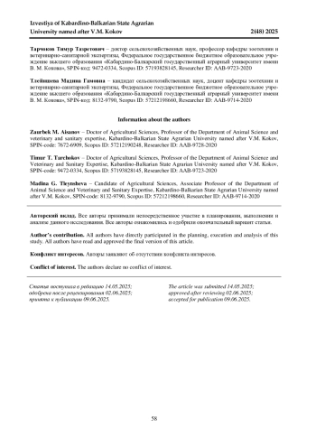 В современном птицеводстве особое внимание уделяется созданию оптимального микроклимата в птичниках, что напрямую влияет на продуктивность и здоровье поголовья. Целью исследования стало научное обоснование и разработка эффективного способа повышения продуктивности и естественной резистентности цыплят-бройлеров кросса «Росс-308» путем использования системы дезинфекции и охлаждения пристенных вентиляционных панелей закрытых птичников. Исследование проводилось в производственных условиях ООО Агрогруппа «Баксанский Бройлер» с применением двух групп по 100 голов каждая - опытной и контрольной. В ходе эксперимента установлено, что применение данной технологии положительно сказалось на ростовых показателях, сохранности поголовья и снижении кормовой себестоимости. К 37-дневному возрасту живая масса бройлеров опытной группы превышала массу контрольной группы на 5,39%, а затраты корма сократились на 8,3%. Индекс продуктивности у опытной группы составил 418 баллов, что на 58,7 единиц выше, чем у контрольных птиц. Также наблюдался рост убойного выхода на 4% и увеличение доли тушек первой категории на 3%. Гематологические исследования показали, что все параметры крови находились в пределах физиологической нормы. У цыплят опытной группы отмечено повышение уровня гемоглобина на 2,95%, бактерицидной активности сыворотки крови на 3,73% и лизоцимной активности на 1,79%, что указывает на усиление неспецифической резистентности организма. Полученные результаты подтверждают целесообразность внедрения системы дезинфекции и охлаждения пристенных вентиляционных панелей в закрытых птичниках с целью повышения эффективности производства мяса бройлеров и улучшения физиологического статуса птиц.
