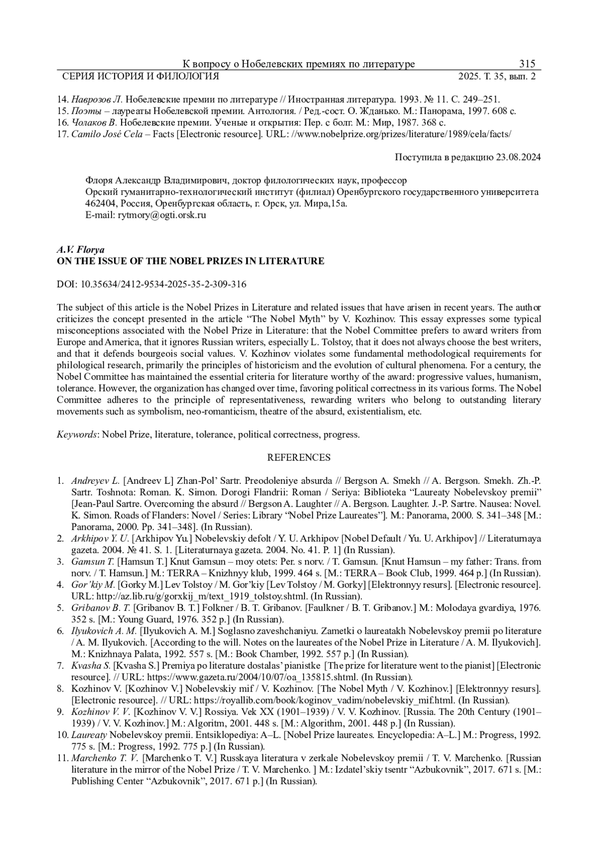 11. Марченко Т. В. Русская литература в зеркале Нобелевской премии. М.: Издательский центр “Азбуковник”, 2017. 671 с. EDN: KQHZSL