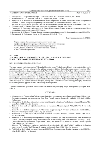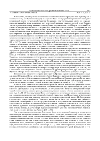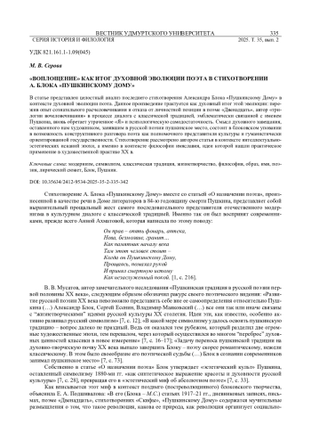 В статье представлен целостный анализ последнего стихотворения Александра Блока «Пушкинскому Дому» в контексте духовной эволюции поэта. Данное произведение трактуется как духовный итог этой эволюции: пережив опыт сознательного расчеловечивания и отказа от личностной позиции в поэме «Двенадцать», автор «трилогии вочеловечивания» в процессе диалога с классической традицией, эмблематически связанной с именем Пушкина, вновь обретает утраченное «Я» и психологическую самодостаточность. Смысл духовного завещания, оставленного нам художником, занявшим в русской поэзии пушкинское место, состоит в блоковском уповании в возможность конструктивного разговора поэта как полномочного представителя культуры и гуманистически ориентированной государственности. Стихотворение рассмотрено автором статьи в контексте интеллектуально-эстетических исканий эпохи, а именно в контексте философии имяславия, идеи которой нашли практическое применение в художественной практике ХХ в.