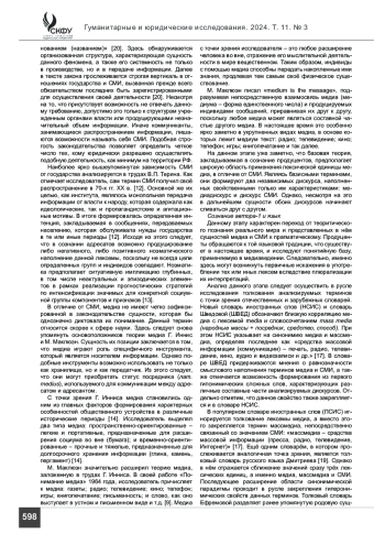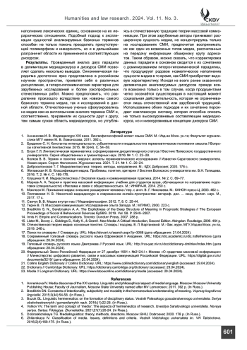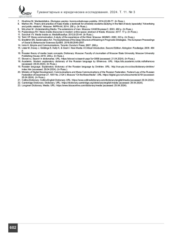 Материалы и методы. Эмпирическим материалом статьи послужили как отечественные, так и зарубежные исследования, монографические работы, толковые словари, а также учебные пособия в области медиа. Кроме общенаучных исследовательских методов базой работы стал герменевтический анализ, а именно лексико-герменевтическая технология анализа. Данная технология была углублена за счет двух методов: дефиниционного анализа словарных статей и структурно-ноэматического метода.