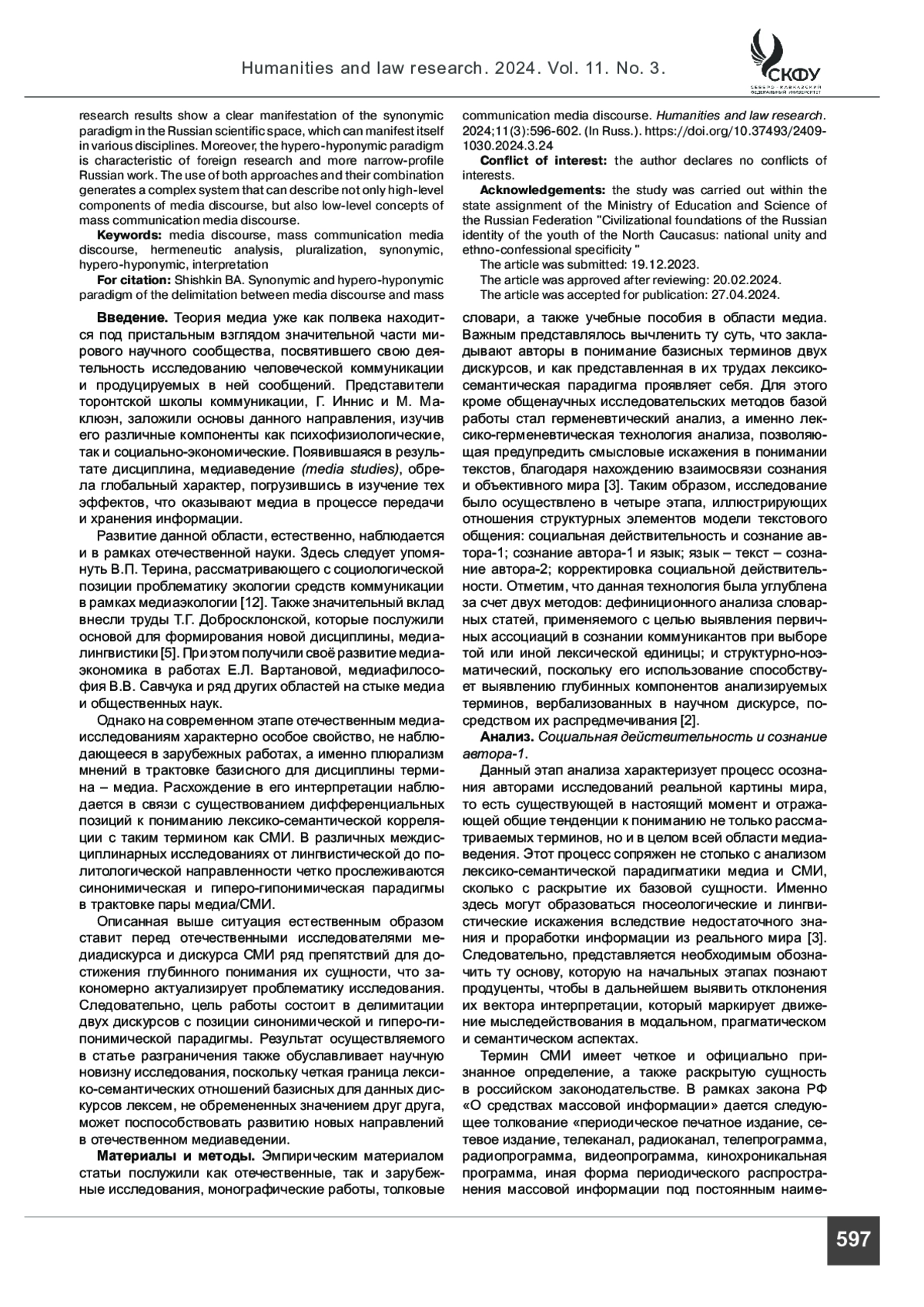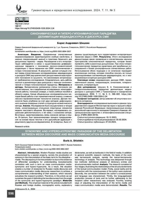 ШИШКИН Б. А. СИНОНИМИЧЕСКАЯ И ГИПЕРОГИПОНИМИЧЕСКАЯ ПАРАДИГМА ДЕЛИМИТАЦИИ МЕДИАДИСКУРСА И ДИСКУРСА СМИ // ГУМАНИТАРНЫЕ И ЮРИДИЧЕСКИЕ ИССЛЕДОВАНИЯ. 2024. ТОМ 11, № 3
